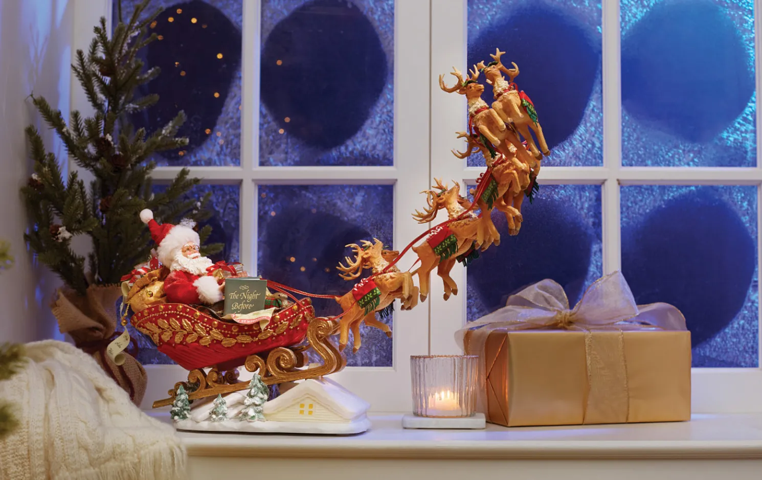 Up! Up! And AWAY! Santa takes flight in this stunning Christmas figure. At the bottom sits the rooftops of two snow covered homes as Santa’s beautiful gold and red sleigh takes flight! The Sleigh features gold leaves and gold jewels following the contours while the jolly old elf sits snuglyinside with a mountain of gifts spilling out of a golden bag and he holds The Night Before Christmas story. In front of the sleigh the reindeer take off! Each one with holly decoratingtheir antlers, ells around their neck, a red and green blanket over their back, all while being linked together with red and gold ribbon!3 AA batteries not included. some assembly needed.Introduced January 2020.Made by Department 56.Made of resin.Dimensions:14.5 in H x 8 in W x 19 in L.Item #: 6005284We are an authorized dealer for Department 56 products.