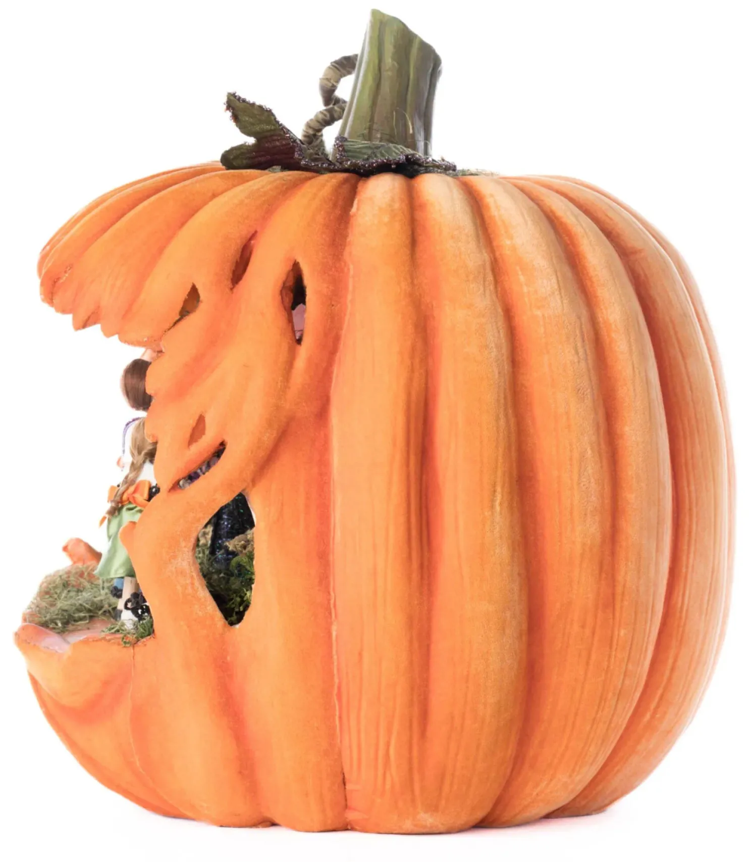 Step into a twisted fairytale with Katherine’s Collection 18″ Hansel and Gretel Pumpkin Scene Halloween Decoration! This vibrant orange pumpkin features a jagged opening that reveals a hauntingly detailed diorama inside. The spooky scene includes a candy-covered house with a sinister witch lurking at the entrance, while Hansel and Gretel cautiously make their way down a moss-lined path surrounded by eerie black trees. The entire scene is illuminated by warm fairy lights, adding a magical glow and enhancing the eerie atmosphere. A beautifully lit and chilling addition to your Halloween décor! Batteries not included.Made by Katherine’s Collection.Dimensions:14 × 14 × 18 in.