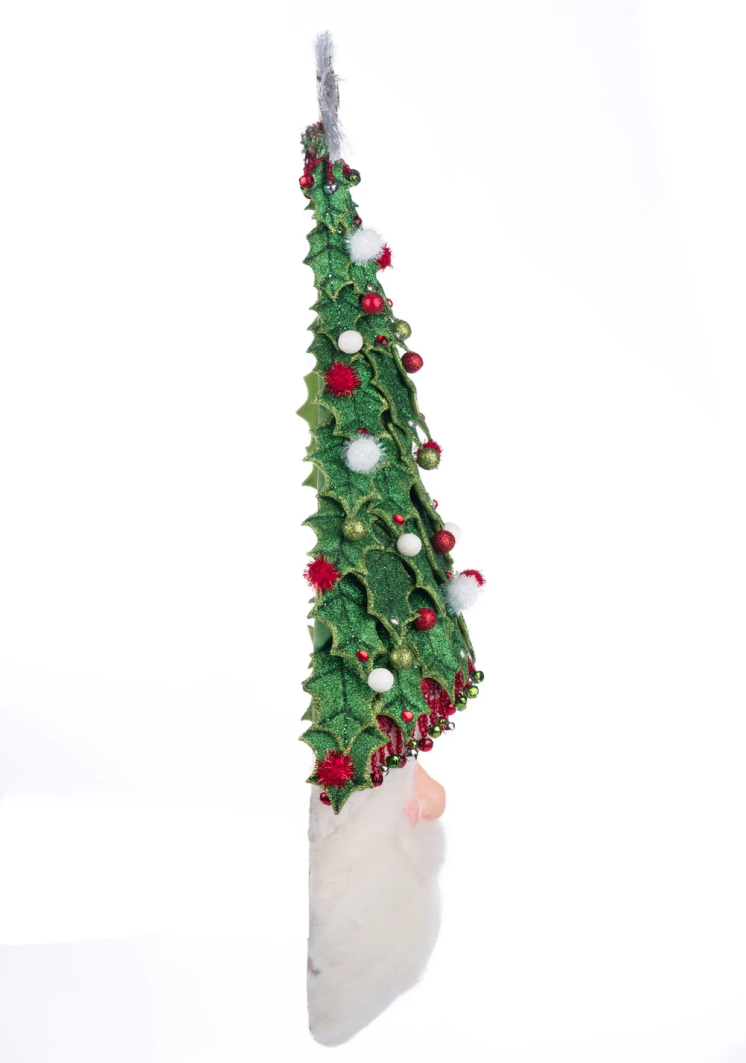 Santa has bright blue eyes and a fluffy white beard in this adorable wall hanging Christmas decoration! The hat atop his head is made up of layered glittering holly leaves speckled with tinsel pom poms and small jewels with a golden star and silver tinsel on the tip! He is sure to be quite the conversation starter this year!Made by Katherine’s Collection.Dimensions:13 × 4 × 30 in.Item #: 28-428357