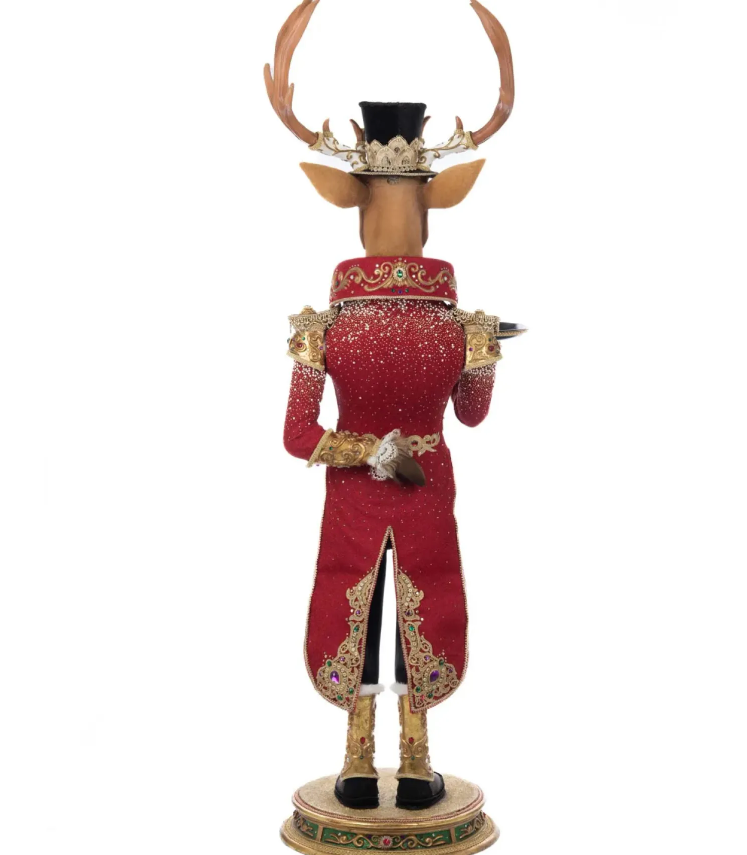 Add a touch of refined holiday charm with the Katherine’s Collection 60.5″ Royal Christmas Ball Reindeer Butler Holding Tray Decoration. This stately reindeer butler is ready to serve in festive style, gracefully holding a black and gold tray in one hand while the other rests smartly behind his back. He’s dressed in a rich deep red jacket with black lapels, adorned with intricate gold embroidery and delicate pearl accents. His gold-trimmed cuffs and shoulder embellishments shimmer with jewel inlays, perfectly complementing his green and gold brocade-style vest and classic bow tie. Topping off his distinguished look, a sleek black top hat with antlers peeking through adds a whimsical, yet regal touch. Ideal for greeting guests or displaying seasonal treats, this elegant piece brings both function and flair to your holiday décor.Made by Katherine’s Collection.Dimensions:25.5 × 17.5 × 60.5 in.