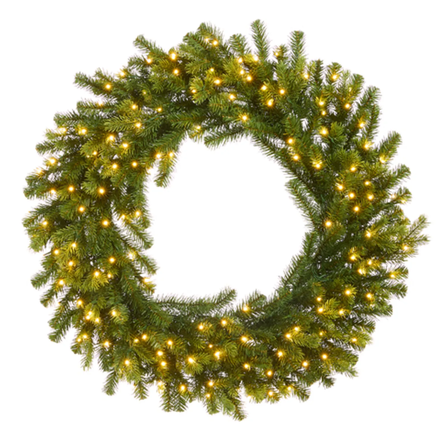Lush green branches wrapped in warm white LED lights make a perfect wreath to use on it’s own or as a base to decorate to your own taste!Each sold individually.Made by Raz Imports.Made of Plastic and PVC.