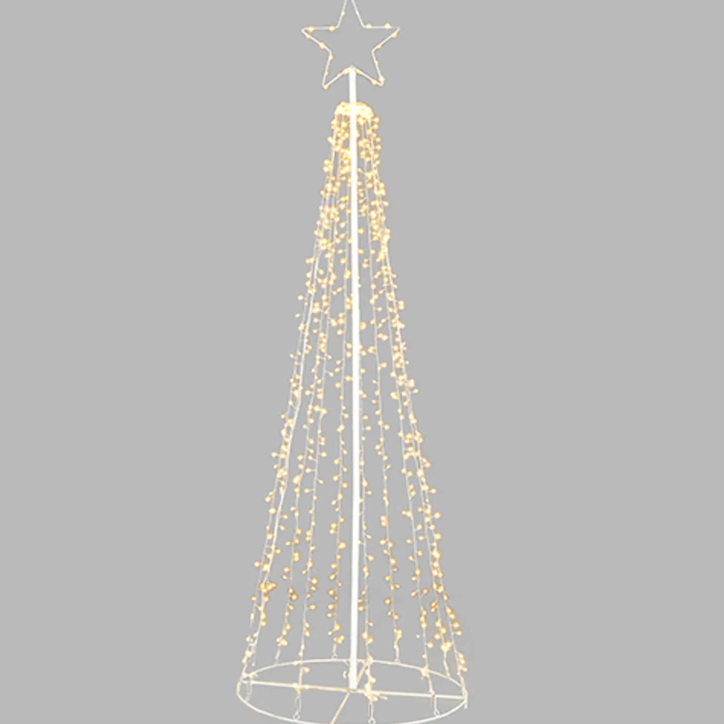 Light up your front yard this holiday with this stunning decoration! It features a tall pole that sticks in your yard and strings of lights tat cascade down from a bright star at the top!Made of Iron, Copper and PVC.670 Warm White Led Lights.With White Frame.Ships Knocked Down.Indoor and Outdoor Use.8 Functions.Includes 1 DC Adapter.Lights Approx.10,000 Hours.Approx.16′ of Wire to Adapter.Dimensions: 4.5′ or 6′ tall.Item #: L4240625 or L4240613