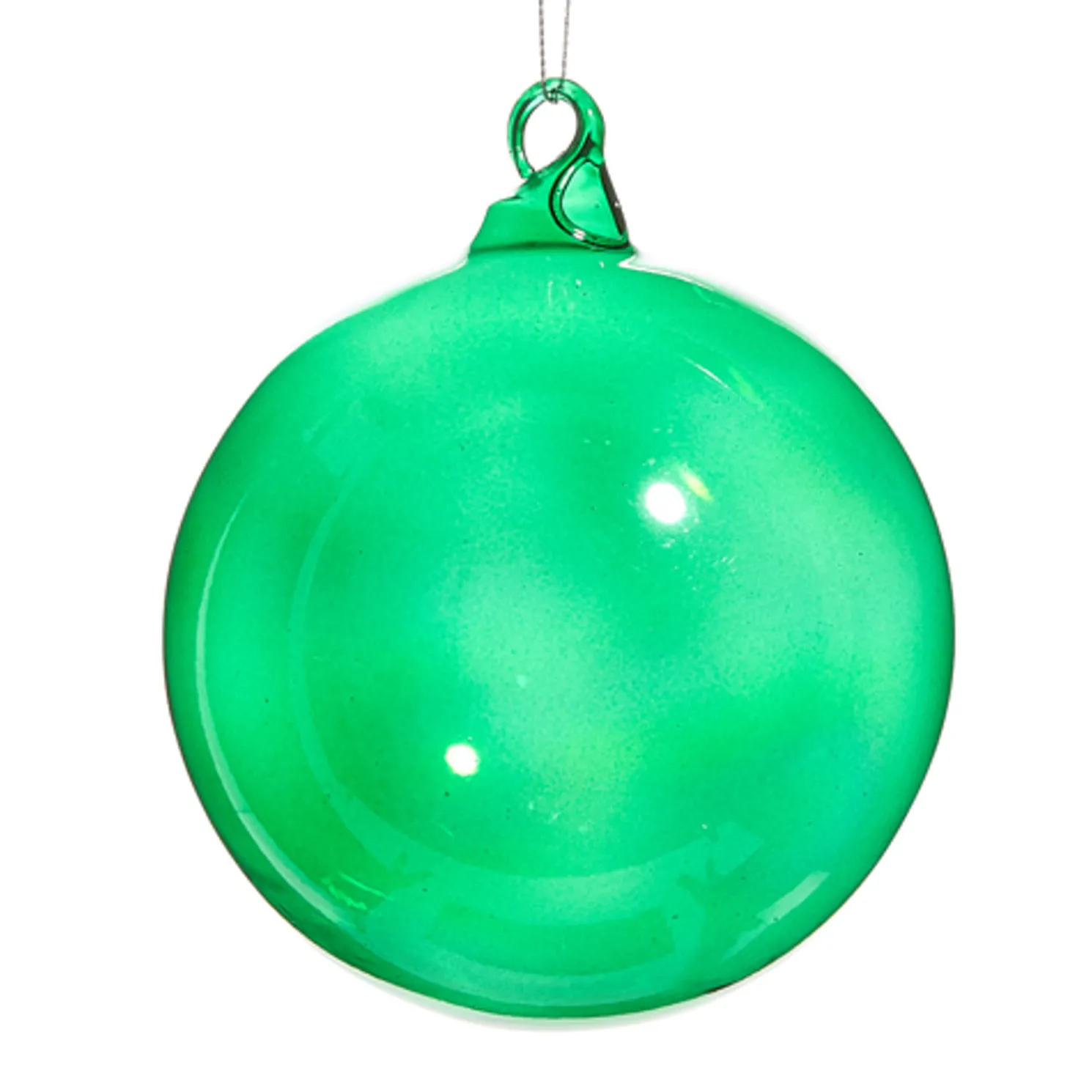 Decorate your tree with a few bright green blow glass ornaments! Choose small or large in these stunning traditional green colored ball ornaments!Each sold individually.Made by Raz Imports.Made of glass.Dimensions: 4″ or 5″.