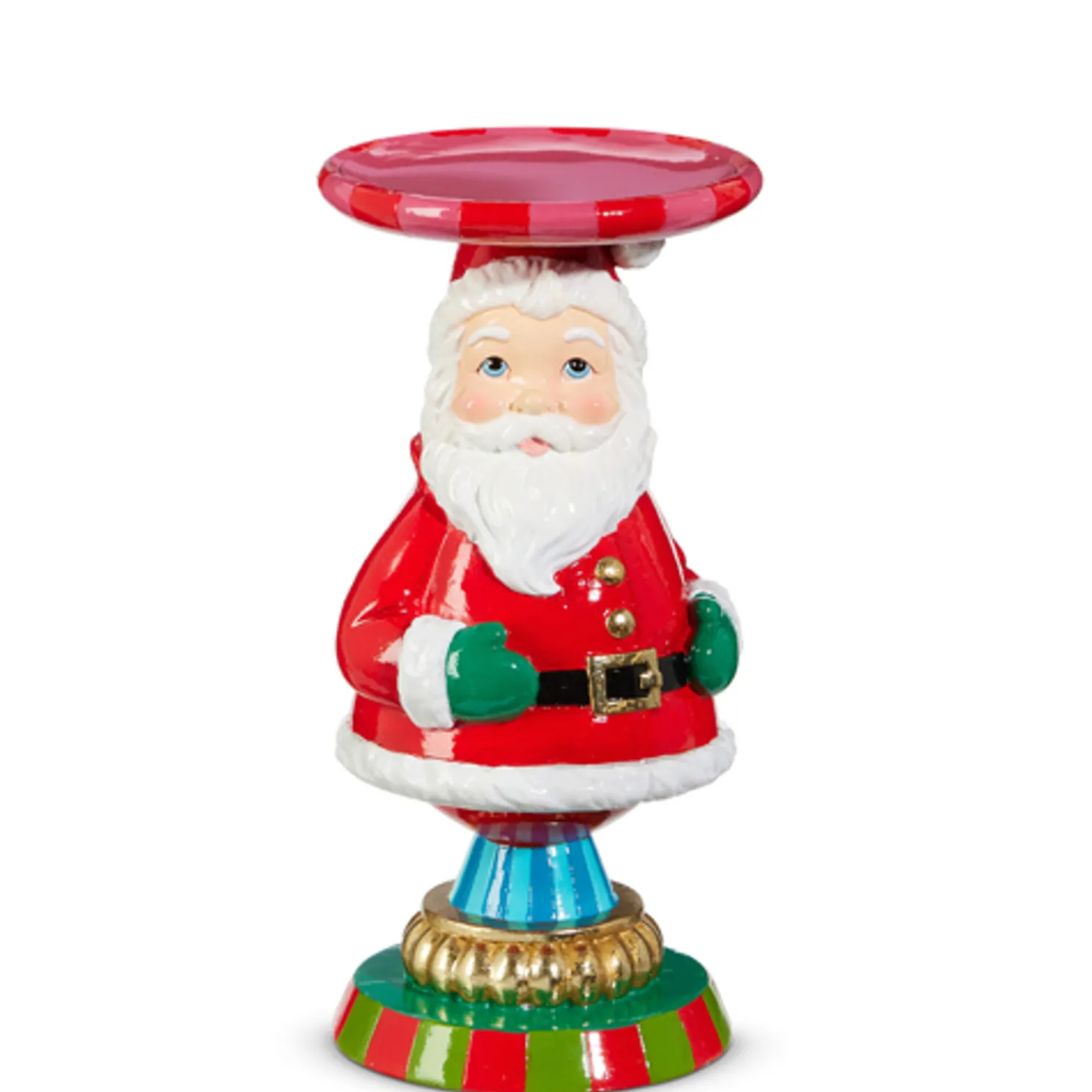 Display your favorite flameless candle or small figure with these retro Christmas stands! Choose a sweet smiling snowman with bright blue eyes or Santa wearing his signature red suit and sparkling blue eyes! The pedestal top and base are painted with colorful stripes and gold accents!Each sold individually.Made by Raz Imports.Made of resin.Dimensions:4.5″ L X 4.25″ W X 9″ H.