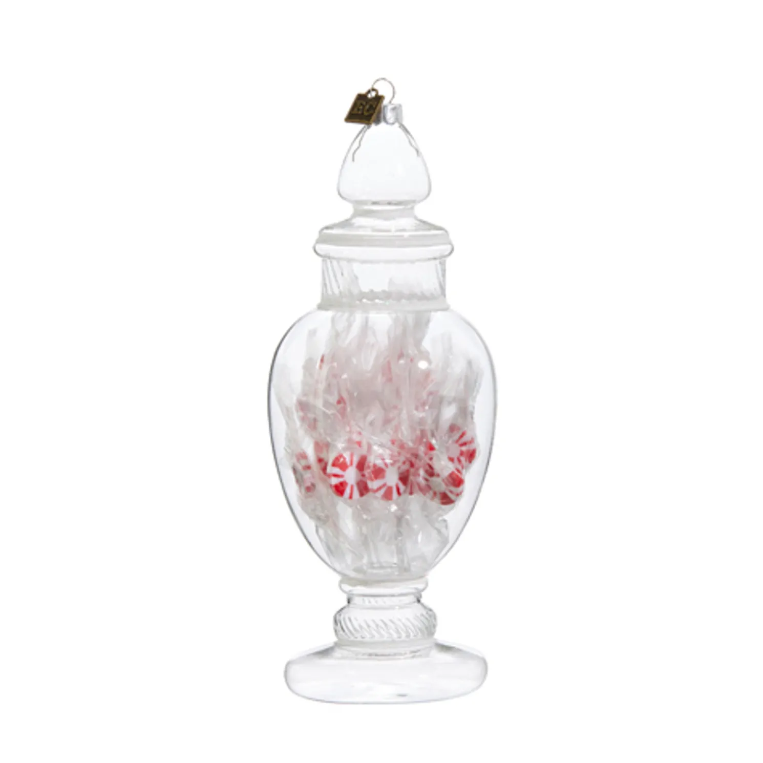 Eric Cortina is known for his spectacular attention to detail and stunning Christmas ornaments! This one features a clear glass jar filled with red and white peppermint candies individually wrapped in clear plastic!Made by Raz Imports.Made of glass and clay.Dimensions:3.25″ D X 8.25″ H.