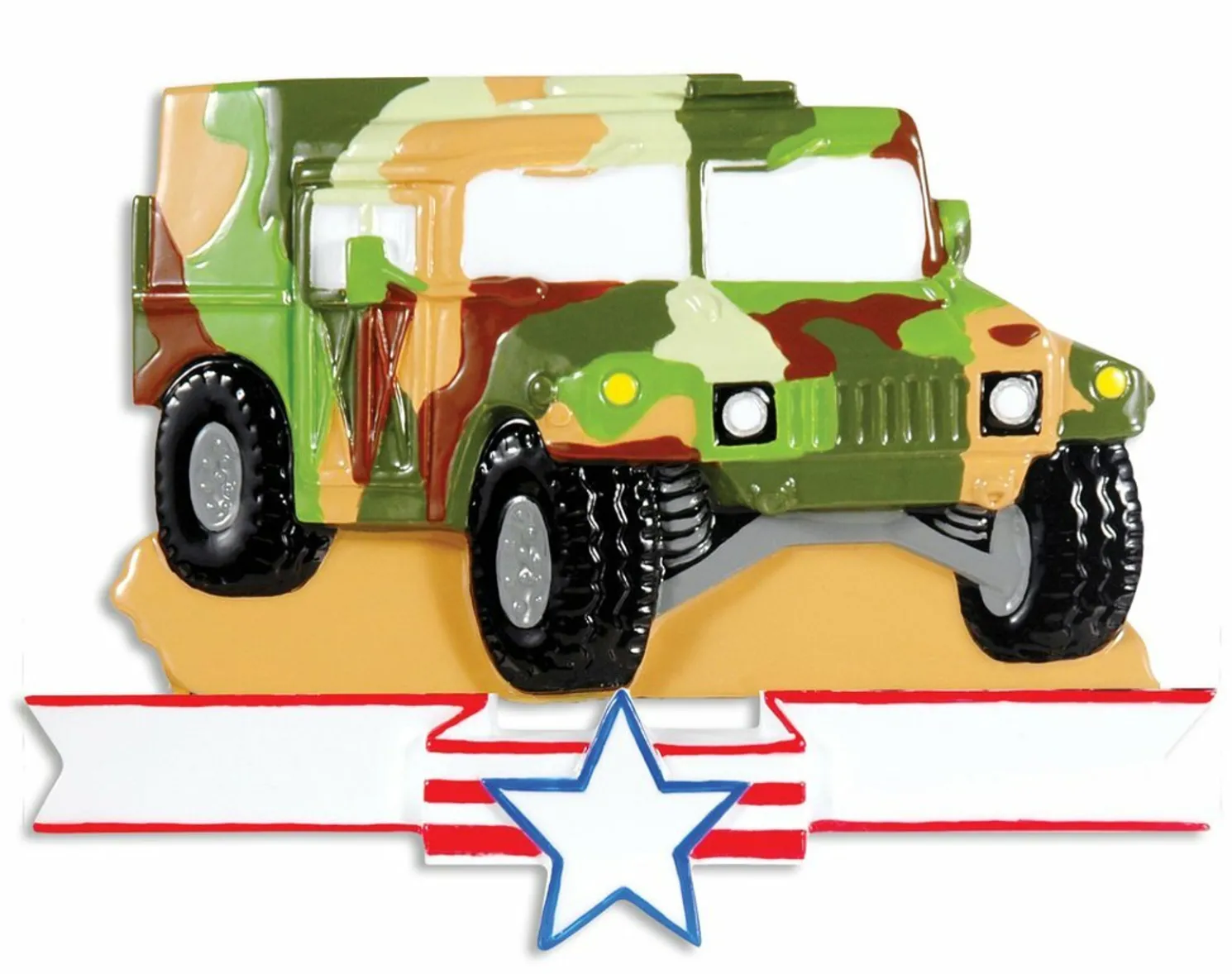 Pay tribute to the soldier in your life with this ornament It features a camo humvee with a banner and stars at the bottom to put your name and the year!Made of resin.Dimensions: 3″ x 3.75″.Item #: OR1395
