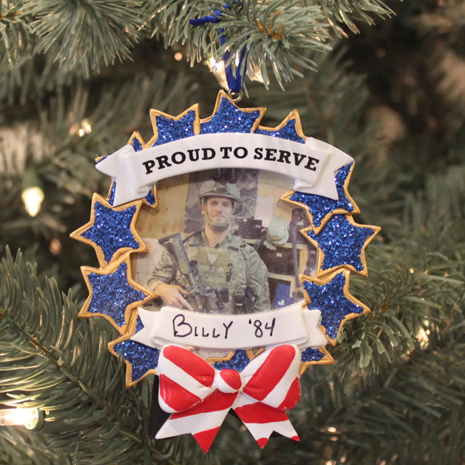 Proudly display your loved one serving in the Armed Forces with this patriotic ornament that can be personalized to make it a lifelong keepsake. Red, white and blue are all represented here in glorious color and glitter to make this ornament a standout on your tree. Dimensions 5 x 4 1/2 x 1/2. Item # PF1435.No additional charge for personalization.