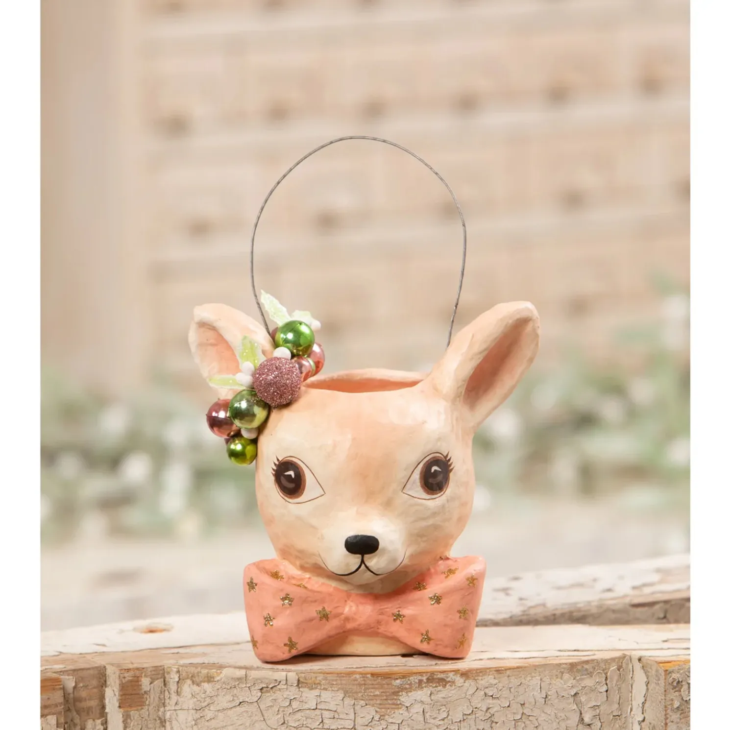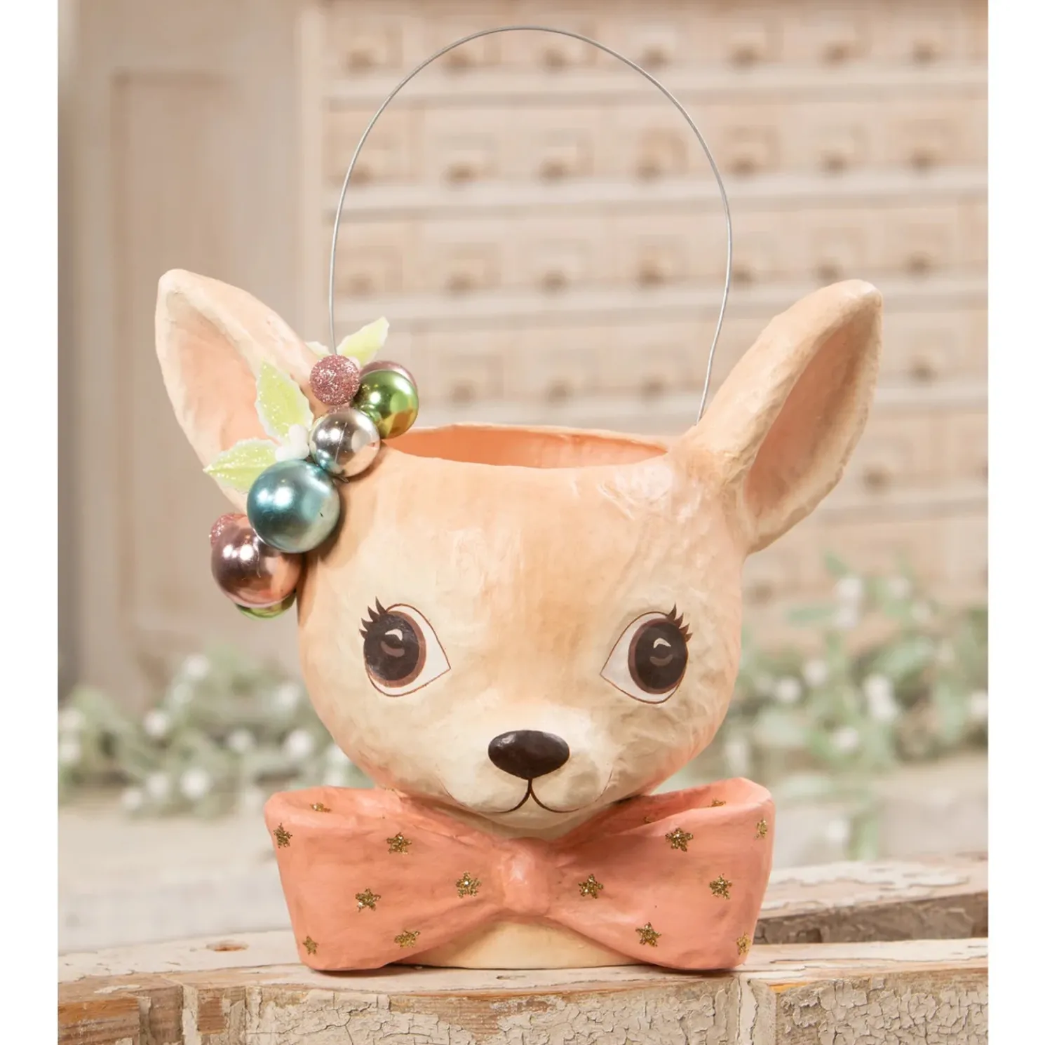 Big brown doe eyes and a light pink tone make this little fawn Christmas bucket the cutest around! She wears a dark blushing pink bow with gold metallic stars and a colorful wreath of ball ornaments around one ear! Fill with your favorite ball garland, picks or bottle brush trees for the perfect display this Christmas season. Choose small or large.Each sold individually.Made by Bethany Lowe.Made ofPaper Mache, beads, holly leaves, glitter, and wire.Dimensions: small:6.25″ X 4.5″ X 6.25″, or large:12″ X 7.5″ X 11.25″.