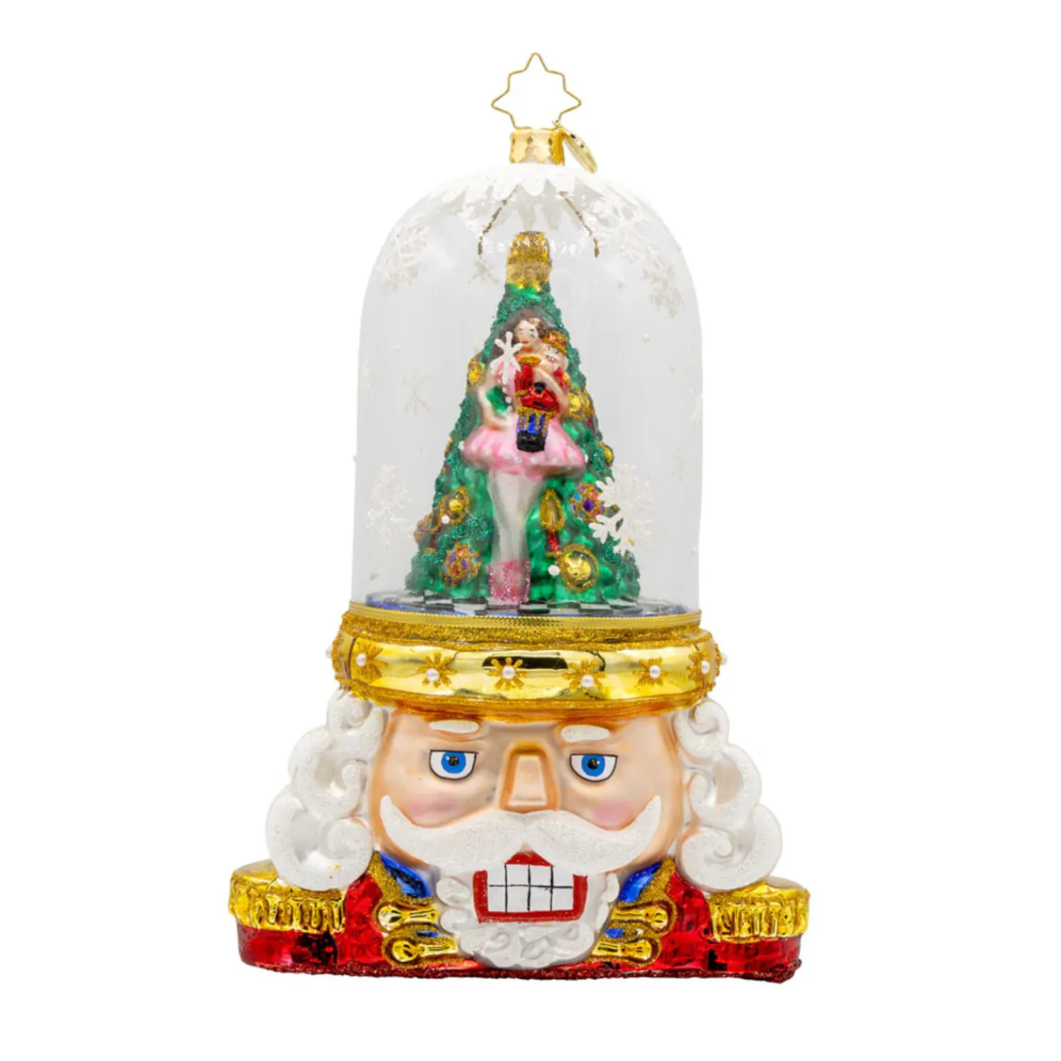 This exquisite Christopher Radko ornament captures a magical Nutcracker Ballet scene beneath a glittering glass dome. Inside, Clara, dressed in a pink ballet outfit, holds her nutcracker beside a lavishly decorated Christmas tree. The dome rests atop a regal white-haired nutcracker dressed in red, blue, and gold with sparkling blue eyes. A limited edition for 2025, this heirloom-quality piece is a true holiday treasure.This item is a limited edition for 2025 ornament.Made by Christopher Radko.Made of glass.Dimensions:7.25 in (H) x 5 in (L) x 2.5 in (W).