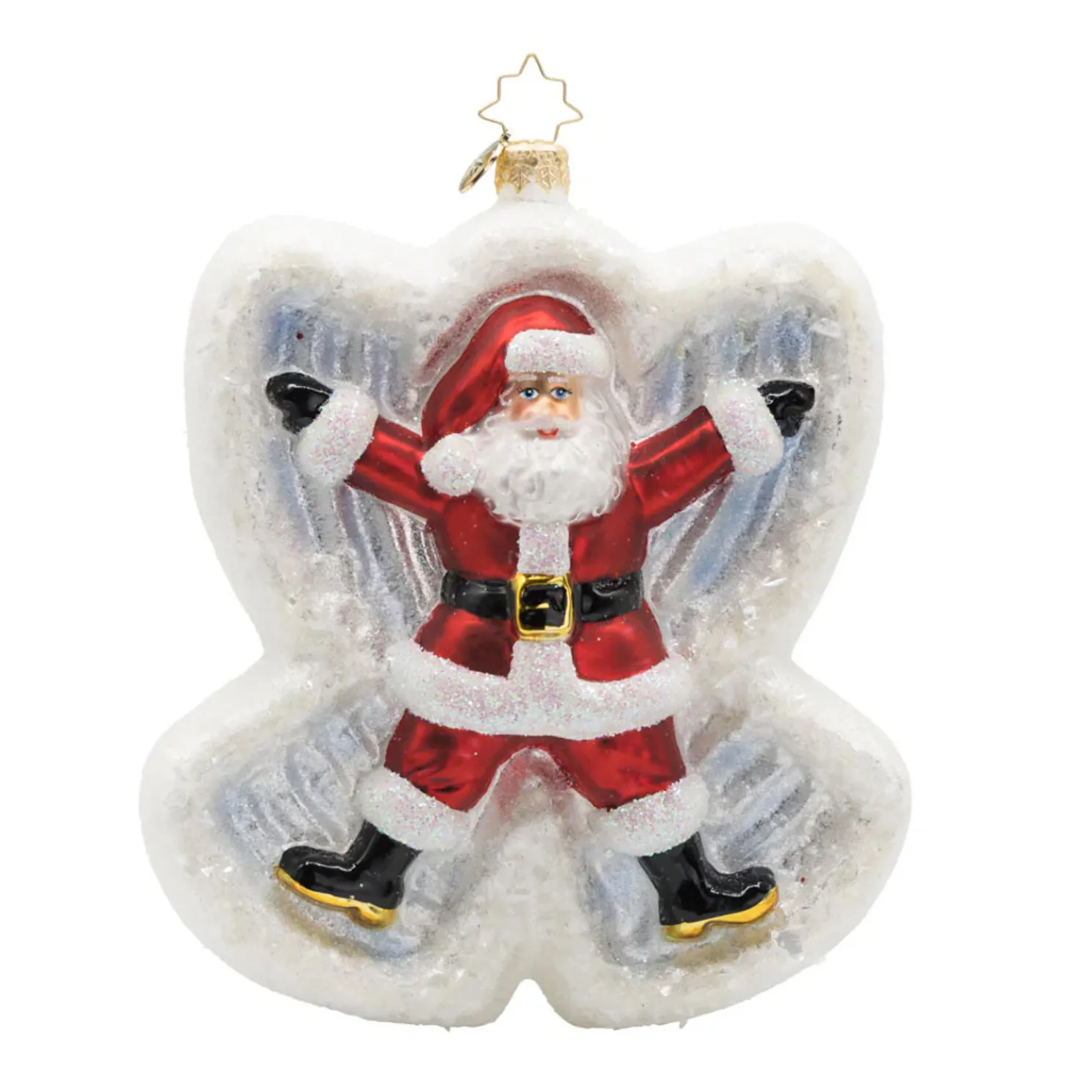 Christopher Radko’s “Santa Snow Angel” Double-Sided Glass Christmas Ornament proves that even Santa and Mrs. Claus can’t resist playing in the snow! This delightful ornament features the cheerful couple side by side, flailing their arms to create the most perfect snow angel. They’re dressed in their holiday finest, accented with golden details and rich deep blue tones that add beautiful dimension to the glittering white snow beneath them. With its double-sided design, you’ll enjoy a perfect view from any angle — a whimsical touch for your tree and a joyful reminder of the magic of winter fun!Made by Christopher Radko.Made of glass.Dimensions:6 in (H) x 4.75 in (L) x 1.5 in (W).