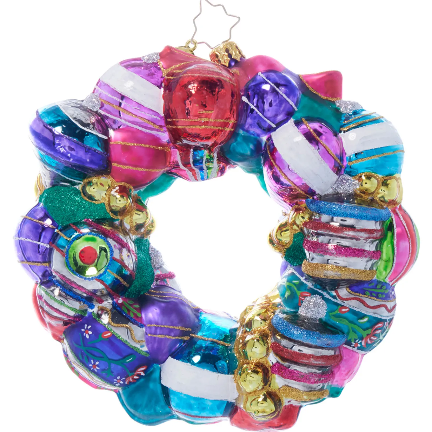 Add a touch of color to your holiday decor this holiday with this stunning wreath! It features a cluster of pink and purple ornaments with pink and green glitter and golden accents! It is finished off with a pink bow traced in gold glitter!Made by Christopher Radko.Made of glass.Dimensions:5 in (H) x 5 in (L) x 1.75 in (W).