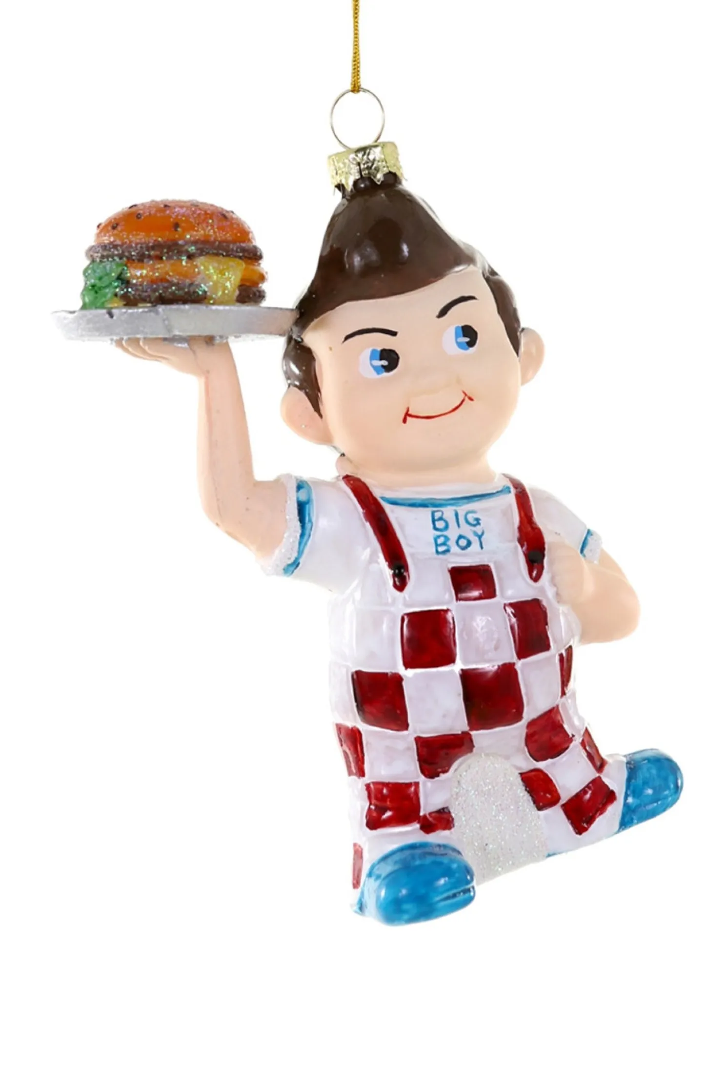 Let’s go grab some burgers! This ornament features the iconic logo of a black haired boy in red and white checkered overalls, bright blue shoes, and a plate with a big ole burger stacked high with all the toppings!Made by Cody Foster.Made of glass.Dimensions: 5.25″ tall.