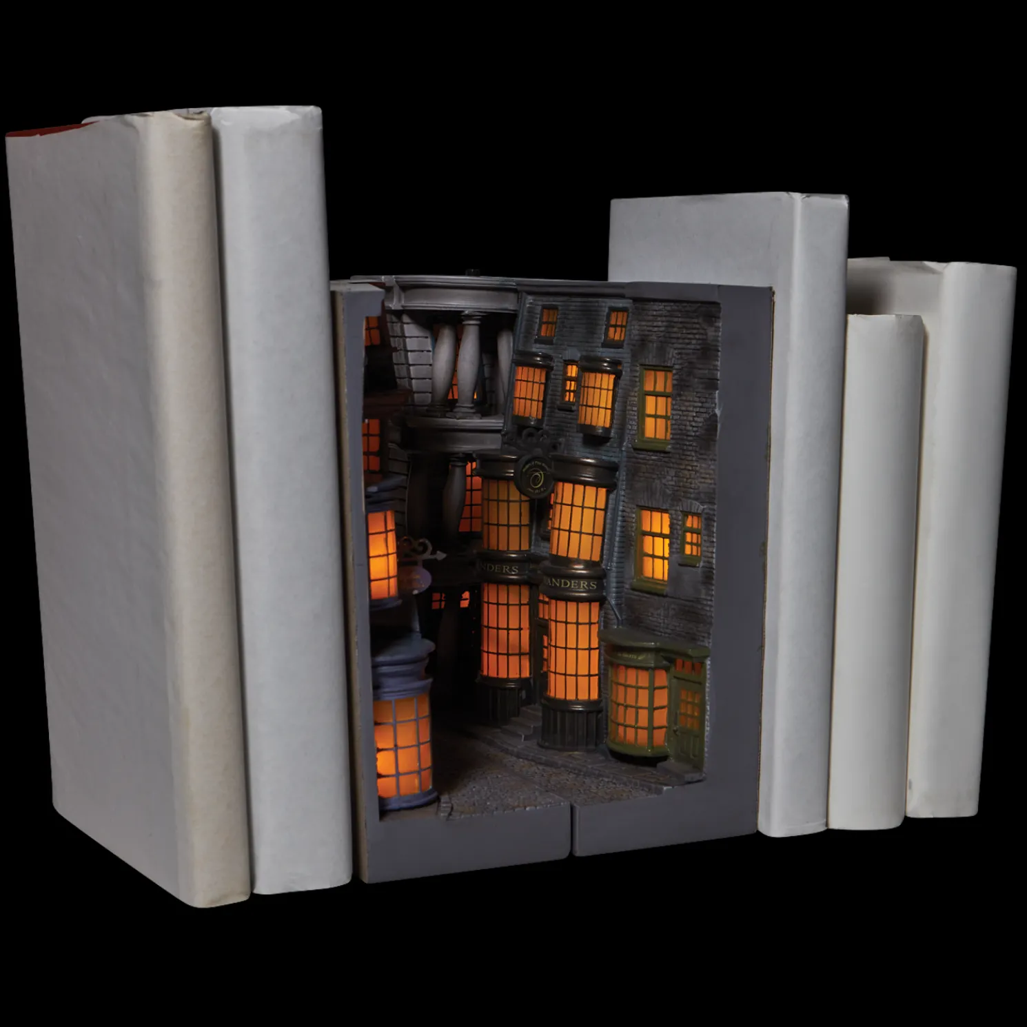 Make your own tiny Diagon Alley right on your book shelf with these cute book ends! Each side features a super detailed scene from the eclectic and bustling Diagon Alley from the Wizarding World Of Harry Potter!Introduced January 2021.Battery operated,requires 3-AAA, not included.Made of resin.Made by Department 56.Dimensions:1 in H x 1 in W x 1 in L.Item #: 6008334