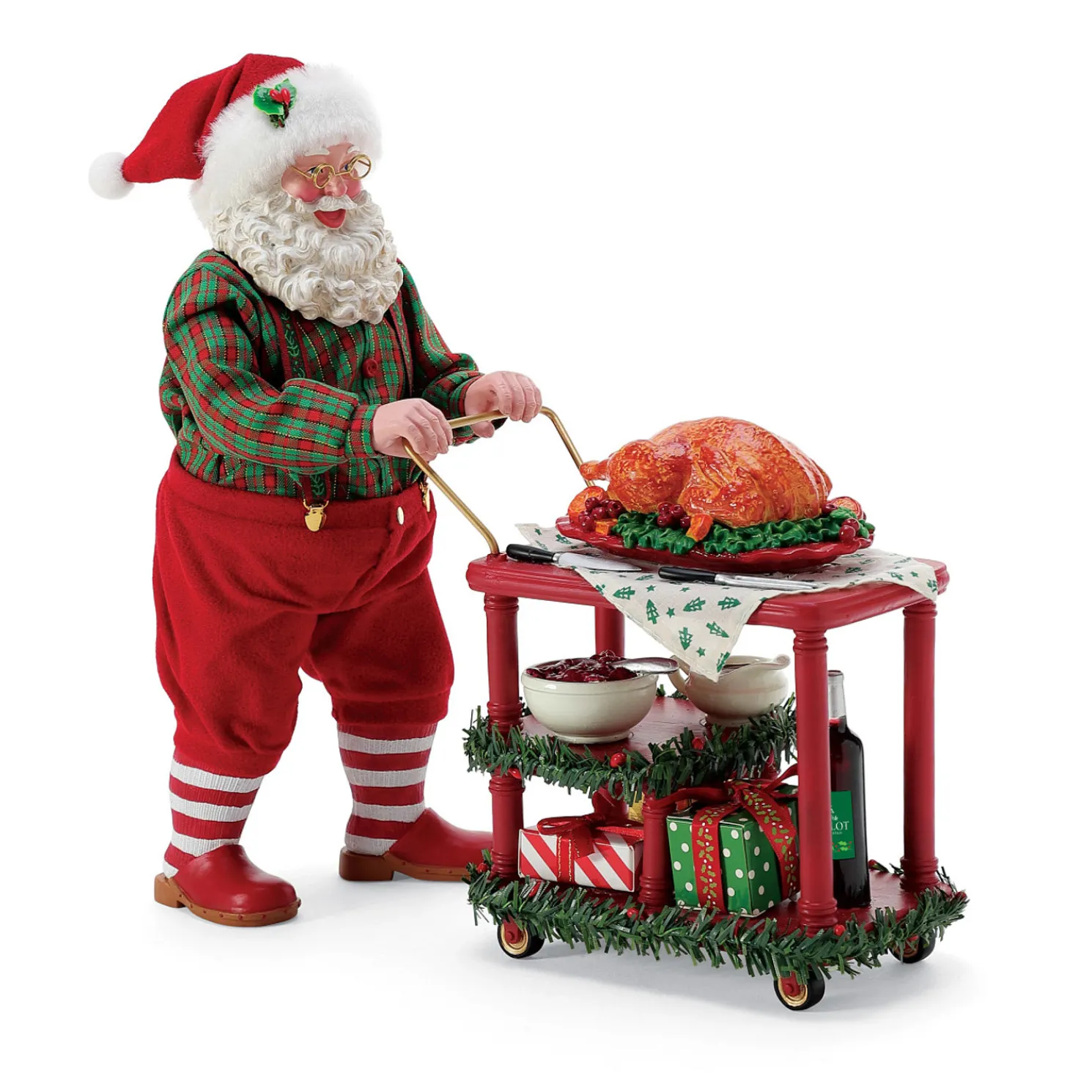 This jolly ole elf really delivers! This Possible Dreams Santa figure is dressed in a festive plaid shirt as he wheels in a cart stacked with a stunning golden brown turkey, cranberry sauce, a gravy boat, and a fresh bottle of wine!Introduced January 2025.Made by Department 56.Made of PVC, Polyester, Resin, Clothtique.Dimensions:10.5in H x 6.5in W x 8.5in L.