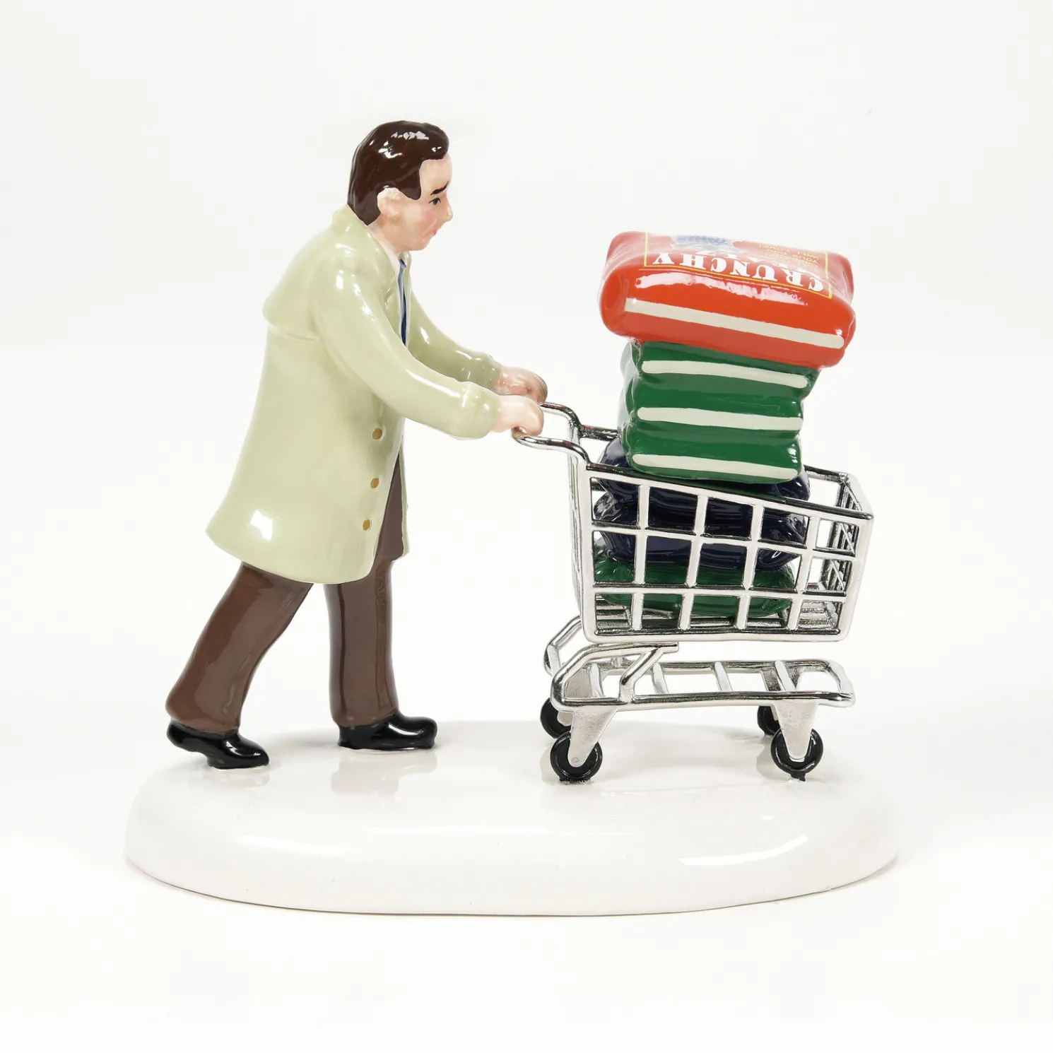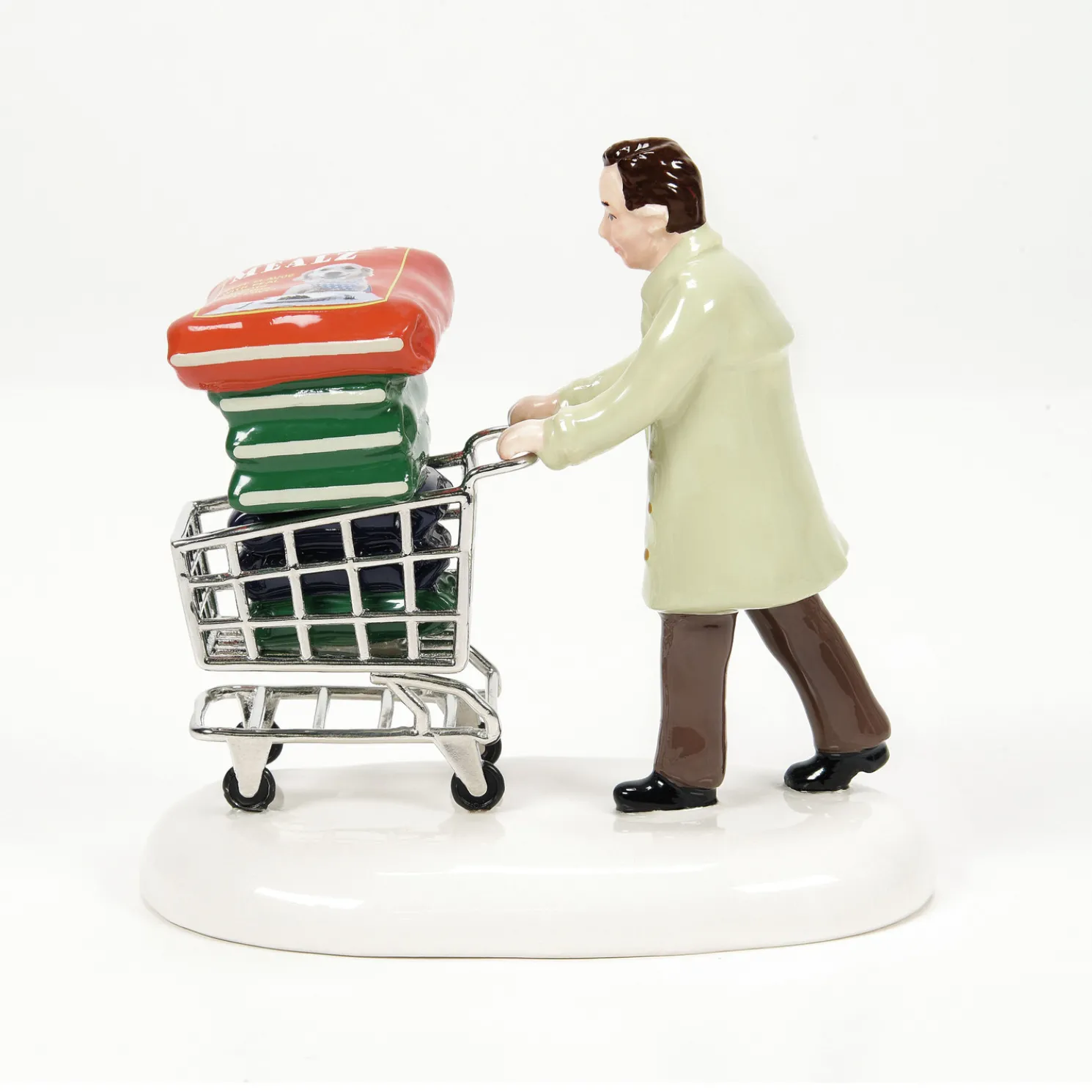 We all know and love Cousin Eddie and how he takes up residence outside of the Griswold’s house for the holidays! This figure is from the scene where Clark and Eddie are at Walmart as Eddie loads up the cart with kibble for his dog, Snots, as he opens up about how hard times have been for his family. The cart is a shiny silver loaded with multiple large bags of dog food and a weary faced Clark pushing it along in a tan coat.Introduced January 2025.Made by Department 56.Made of ceramic.Dimensions:3.62in H x 2.17in W x 3.54in L.