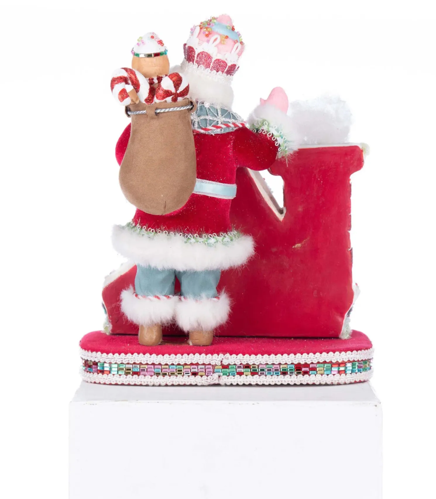Katherine’s Collection 10.5″ Sweet Delights Santa Stocking Holder brings festive fun and sugary charm to your holiday mantel! Santa is perched atop a whimsical gingerbread house, crafted in a warm brown finish and trimmed with peppermint stripes and sparkling candy-colored gems. A red and white striped chimney peeks through the frosting-like roof, as Santa leans cheerfully against it. Dressed in a red suit accented with teal blue, soft pink, and icing-like swirls, he carries a toy-filled brown bag—complete with a cheerful gingerbread man peeking out. A colorful cake-inspired hat tops off his sweet ensemble. Finished with a glittering red hook, this stocking holder is both functional and full of holiday delight.Made by Katherine’s Collection.Dimensions:9 × 8.25 × 10.25 in.Item #: 28-528744