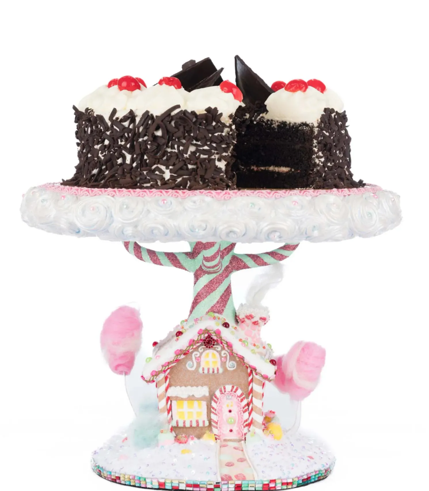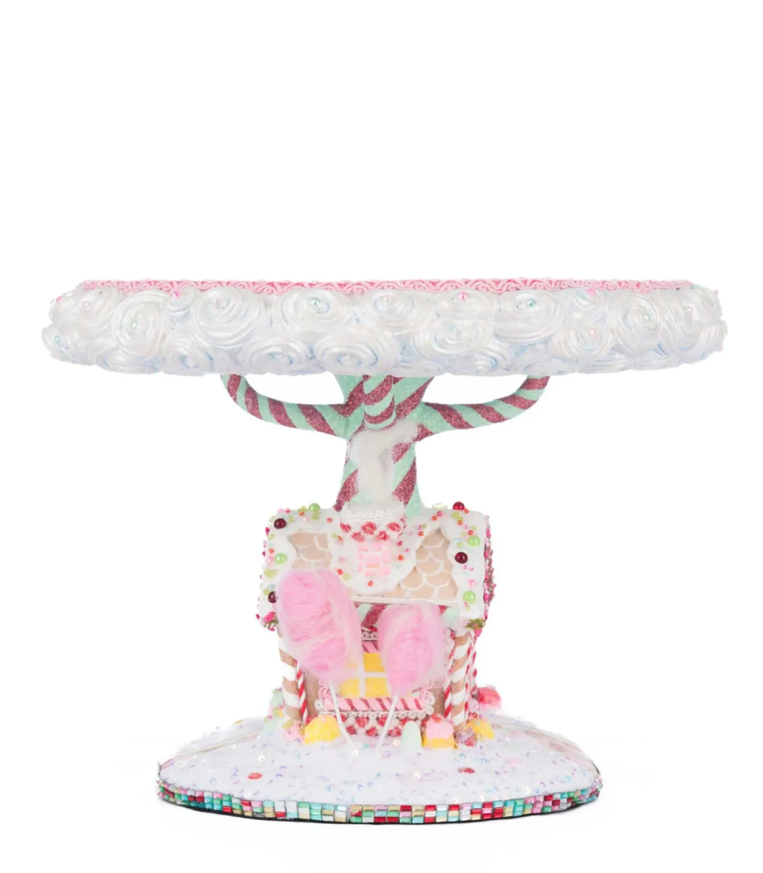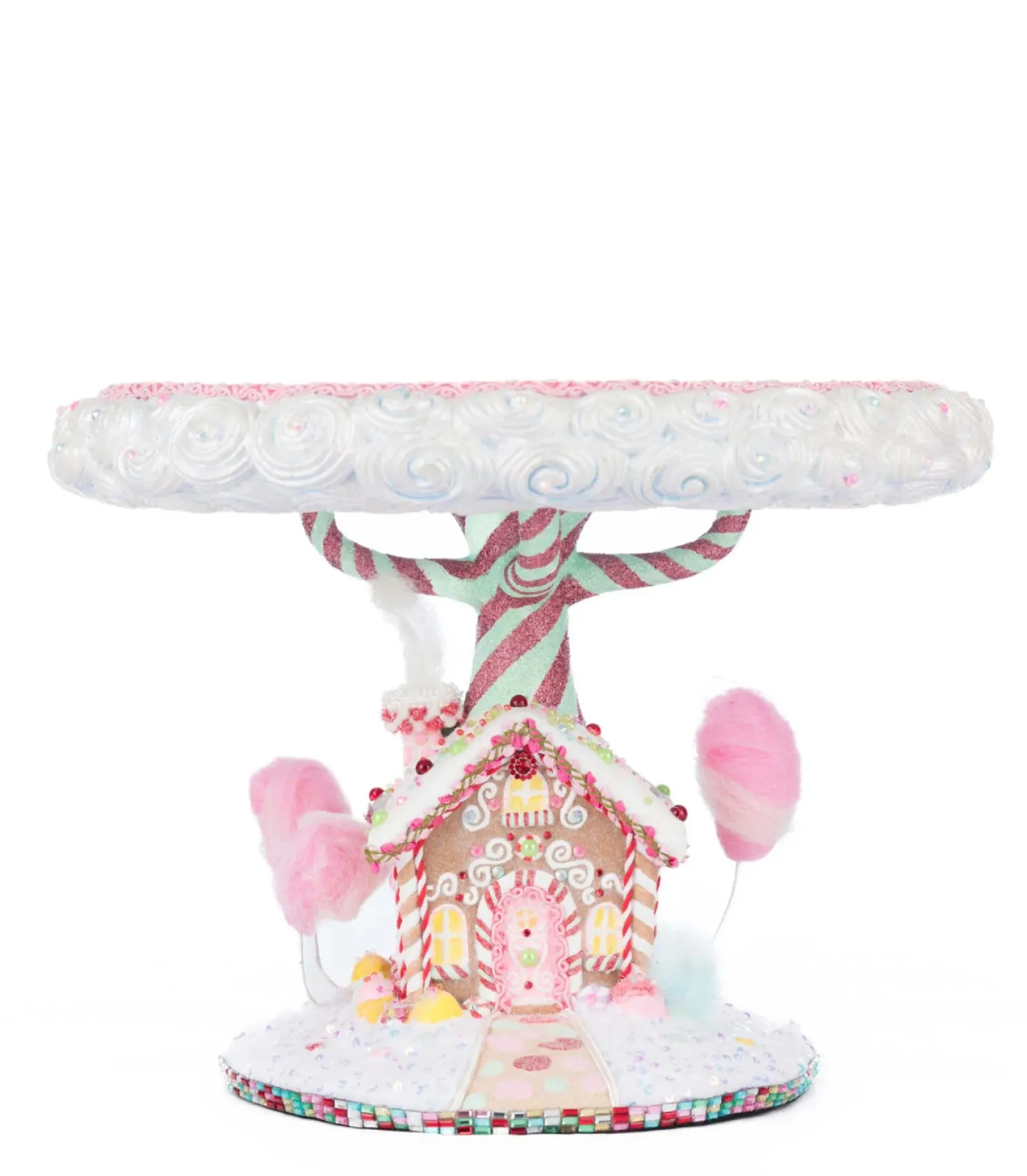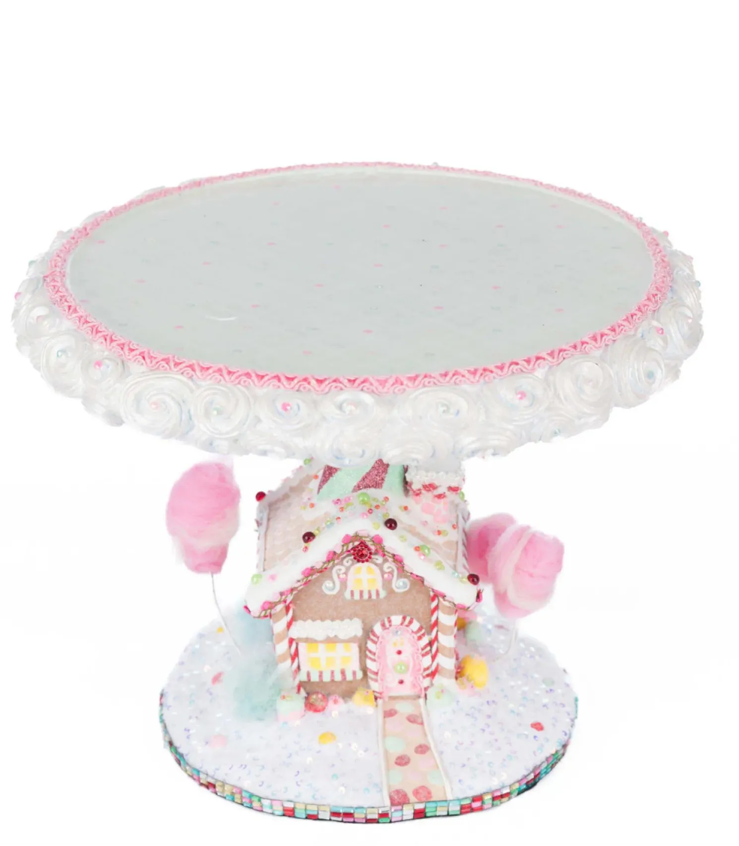 Display the gingerbread house or cake that took you hours to create in style this holiday! This cake stand features a light brown gingerbread house with white icing accents, tiny rosette garland trim, colorful rainbow beading, and a pretty pink door with peppermint trim! The house is lined with colorful candies and sits on a pile of freshly fallen snow with glitter and sequins. Fluffy cotton candy trees sprout from the ground and a large tree with blue and pink swirled bark holds a tray with white swirls on the edges- ready to hold your treats!Made by Katherine’s Collection.Dimensions:12 × 12 × 9 in.