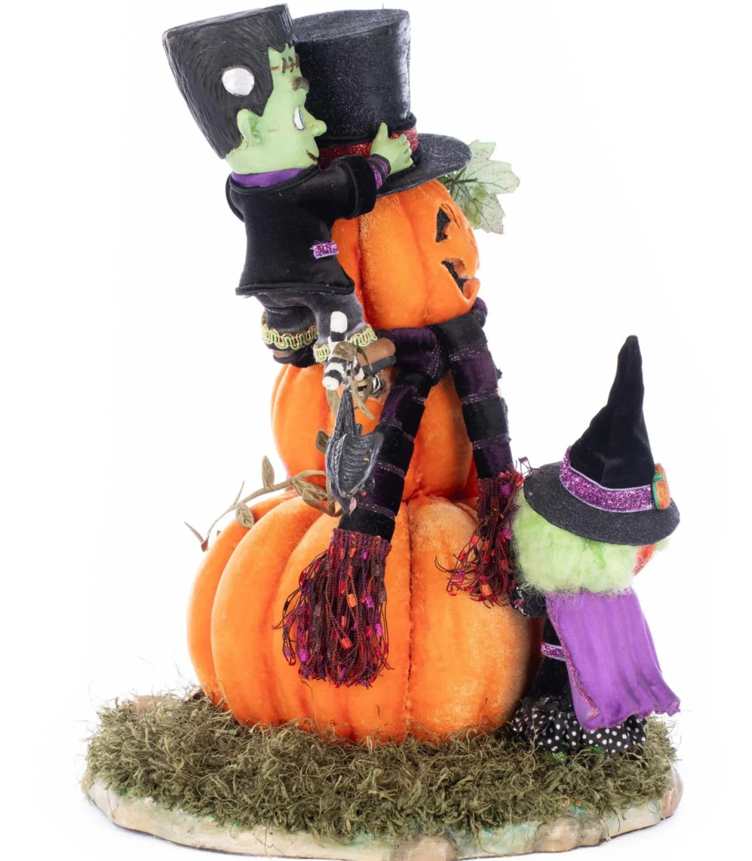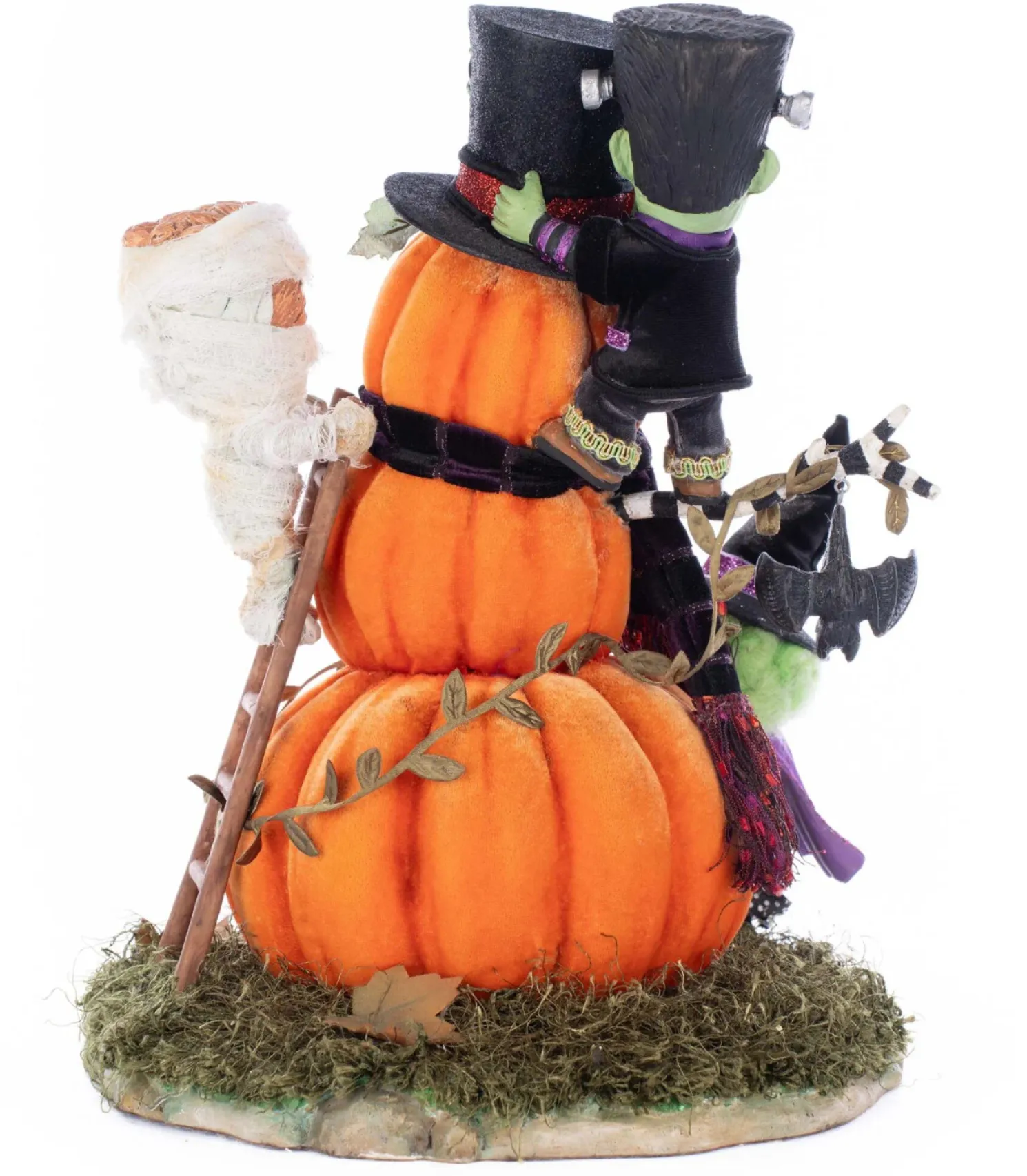 Who needs snow when you’ve got pumpkins? This adorable trio of ghoulish friends is hard at work building their very own Pumpkin Man—the perfect fall pastime for little monsters!Stacked with three plush orange velvet pumpkins, this playful scene features a mummy climbing a ladder to attach an arm, a mini witch carefully adding buttons, and a tiny Frankenstein placing a patchwork top hat atop their spooky creation. The entire piece rests on a base of natural brown moss, adding rustic autumn charm.A delightful and detailed decoration that brings a touch of Halloween whimsy to your mantel, shelf, or tabletop display!Made by Katherine’s Collection.Dimensions:12.25 × 10.5 × 13.25 in.Item #: 28-528654