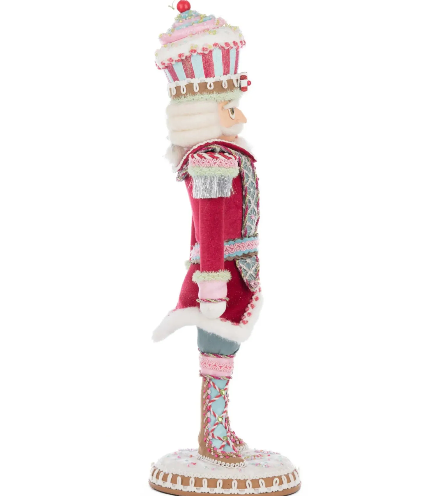 Sergeant Sugar is reporting for holiday duty—serving up festive charm in delicious style! Dressed in a rich pink coat with sparkling silver tinsel epaulettes and matching cuffs, he layers a soft pink vest over a shimmering sequin shirt for extra sparkle. His blue parachute-style pants are tucked into cookie-inspired brown boots adorned with whimsical candy-colored laces. Topping off his sweet ensemble is a playful cupcake hat in pastel tones, finished with a cherry on top! This 19.5-inch tabletop decoration is the perfect blend of classic nutcracker form and sugary fun.Made by Katherine’s Collection.Dimensions:7 × 6.5 × 19.5 in.Item #: 28-528726