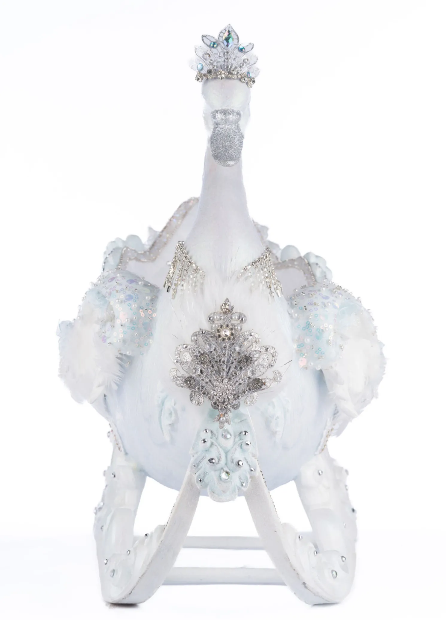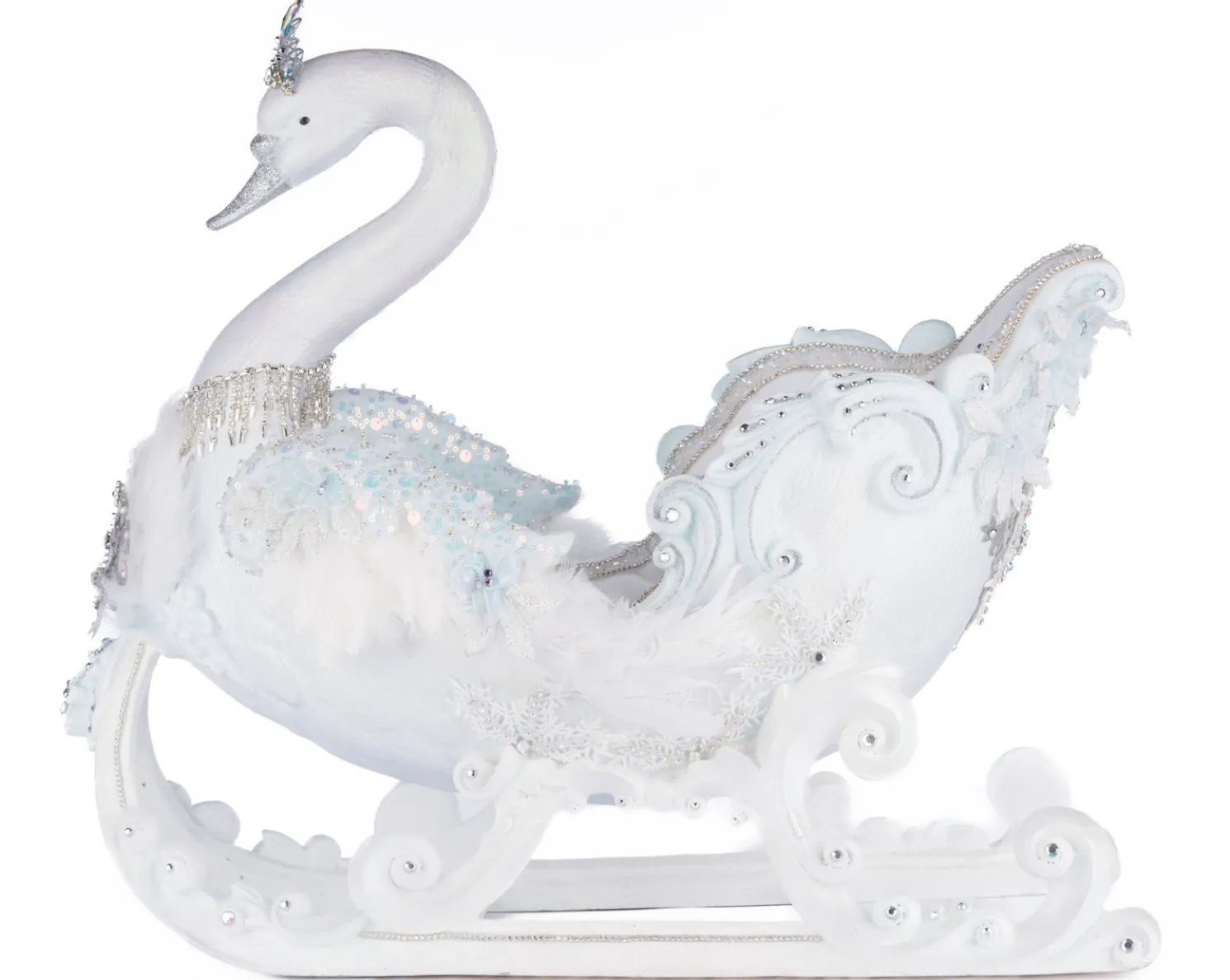 Dazzle your guests with this stunning piece! The body of the swan is hand crafted and sculpted to be a sleigh fit for royalty! It is covered iniridescent crinkled organza fabric with intricate beading and sparkling jewels! Snowflake accents decorate the bottom of the sleigh and soft feathers make her wings The front of the sleigh has the swan’s sleek long neck and sparkling silver glittered beak with a small tiara of silver and blue atop her head. This is perfect to place your favorite Christmas character inside or fill with some of your favorite faux greenery!Made by Katherine’s Collection.Dimensions:21 × 11 × 18 in.