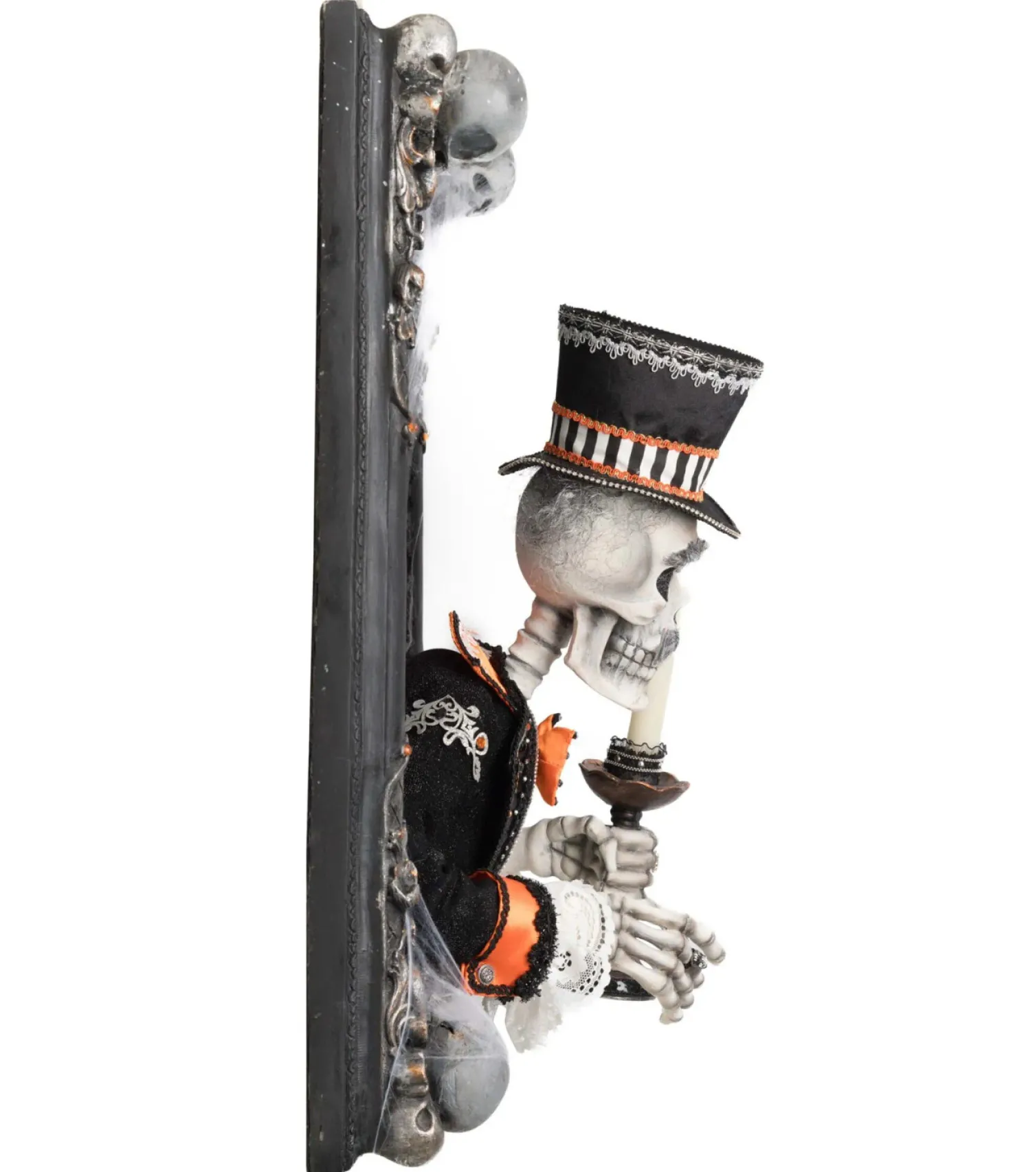 Honor the dearly departed… with a twist! Great Grandpa Macabre isn’t your typical family portrait. This eerie wall piece from Katherine’s Collection features a black ornate frame adorned with tiny orange jewels and mini skulls, perfectly setting the stage for what lies within.At the center, the “portrait” bursts to life—literally—with a 3D skeletal figure that’s far from ordinary. Great Grandpa flaunts ruby-red jeweled eyes, a dashing grey handlebar mustache, and a bedazzled ribcage peeking from beneath his sharp black suit jacket. A classic top hat tops off his ghostly ensemble, and in one skeletal hand, he holds a candlestick, ready to light the way through the haunted halls.A playful blend of creepy and classy, this wall piece makes the perfect statement for your Halloween decor—because every haunted house needs a little family history! Candle included batteries not included.Made by Katherine’s Collection.Dimensions:21.25 × 10 × 24.75 in.Item #: 28-528665