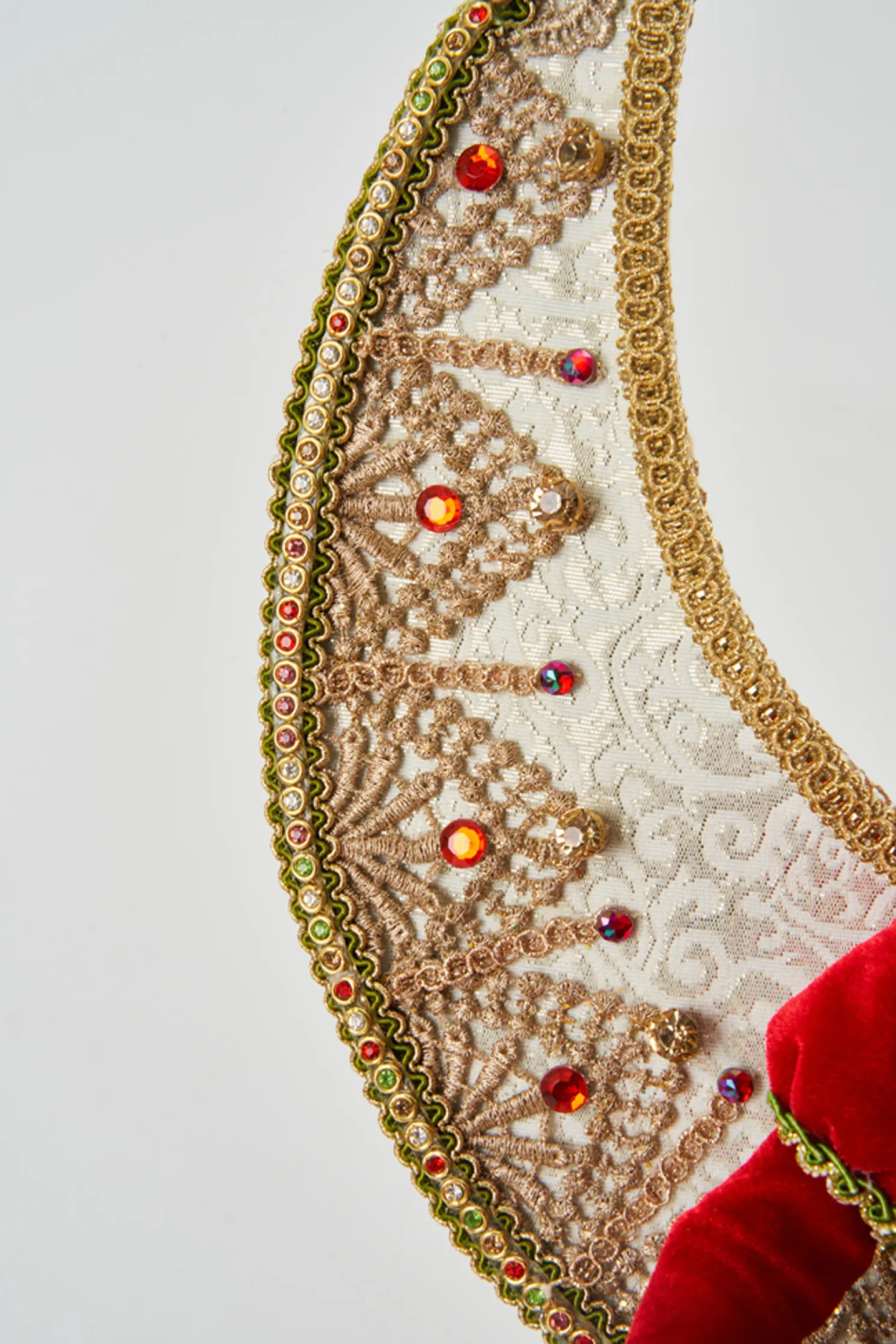 Adorn your mantle with this gorgeous angel! She wears a red velvet dress with puff sleeves and golden embroidery that has hints of green along the white fur trim. Her stunning blonde hair is twisted into an elegant up do and adorned with a golden crown decorated with red jewels. Behind her, a pair of wings swoop up like a crescent moon. The wings are a beautiful white lace with gold embroidery and ornate red jewels!Made by Katherine’s Collection.Made of resin, fabric, and paper mache.Dimensions:19 × 18 × 27.5 in.Item #: 28-228575