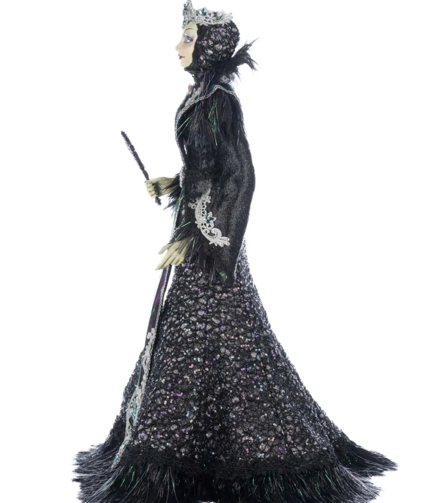 What’s Halloween without a wicked queen? Queen Drusilla is sure to send chills down your spine with her striking beauty and menacing presence. Her bold red lips and dramatic purple smoky eyes, framed by high arched eyebrows, give her a regal yet sinister look. She wears a dress with a heavy feathered collar and iridescent sequined lapels, perfectly complementing the deep black fabric, which is trimmed with intricate silver embroidery. Her dress is cinched with a stunning silver jeweled buckle, echoing the elegance of her crown, which is inlaid with blue and green jewels. This 29″ Wicked Queen Drusilla Doll is the perfect addition to your Halloween décor, bringing both beauty and terror to your collection! Made by Katherine’s Collection.Dimensions:23 × 20 × 29 in.