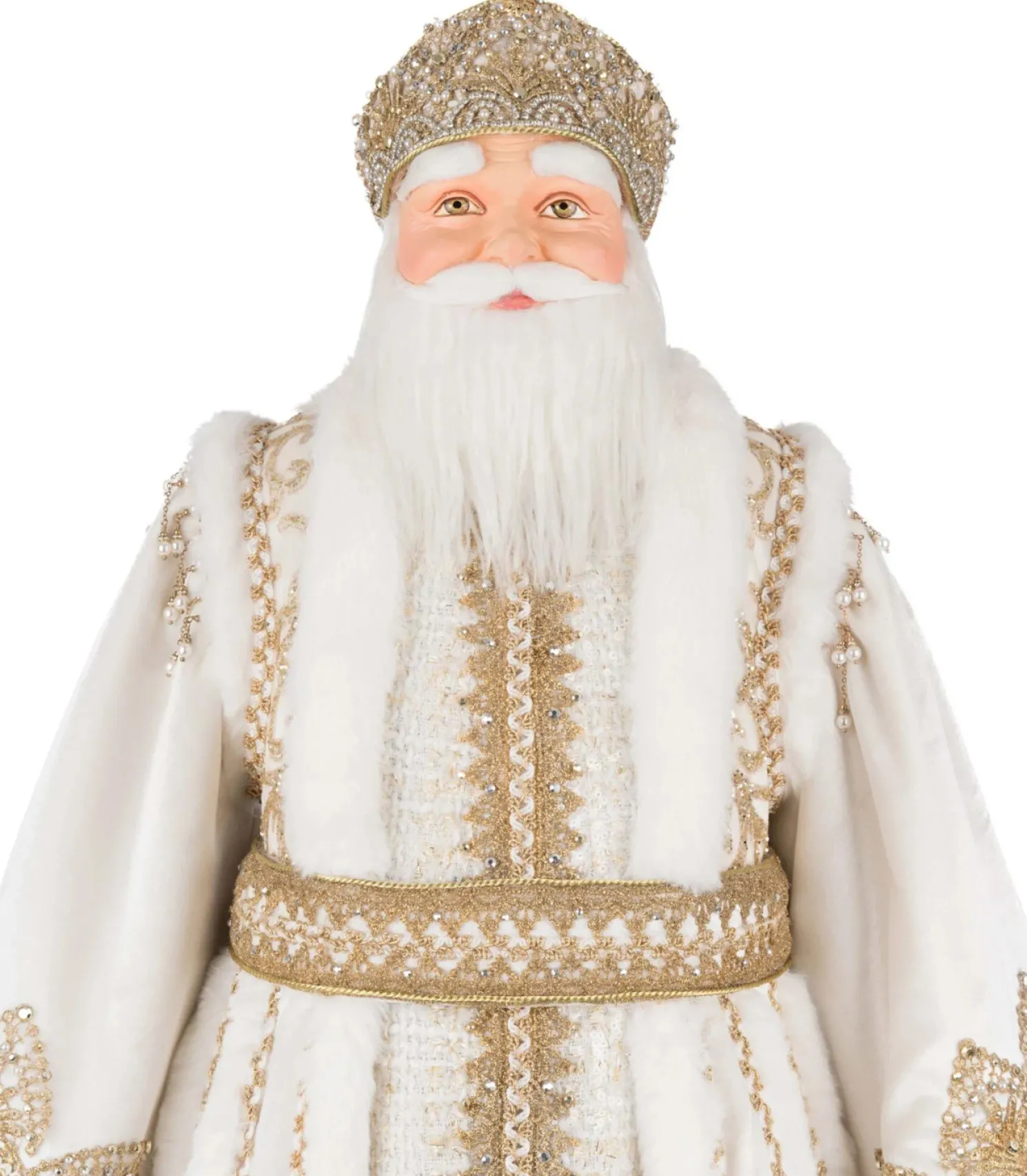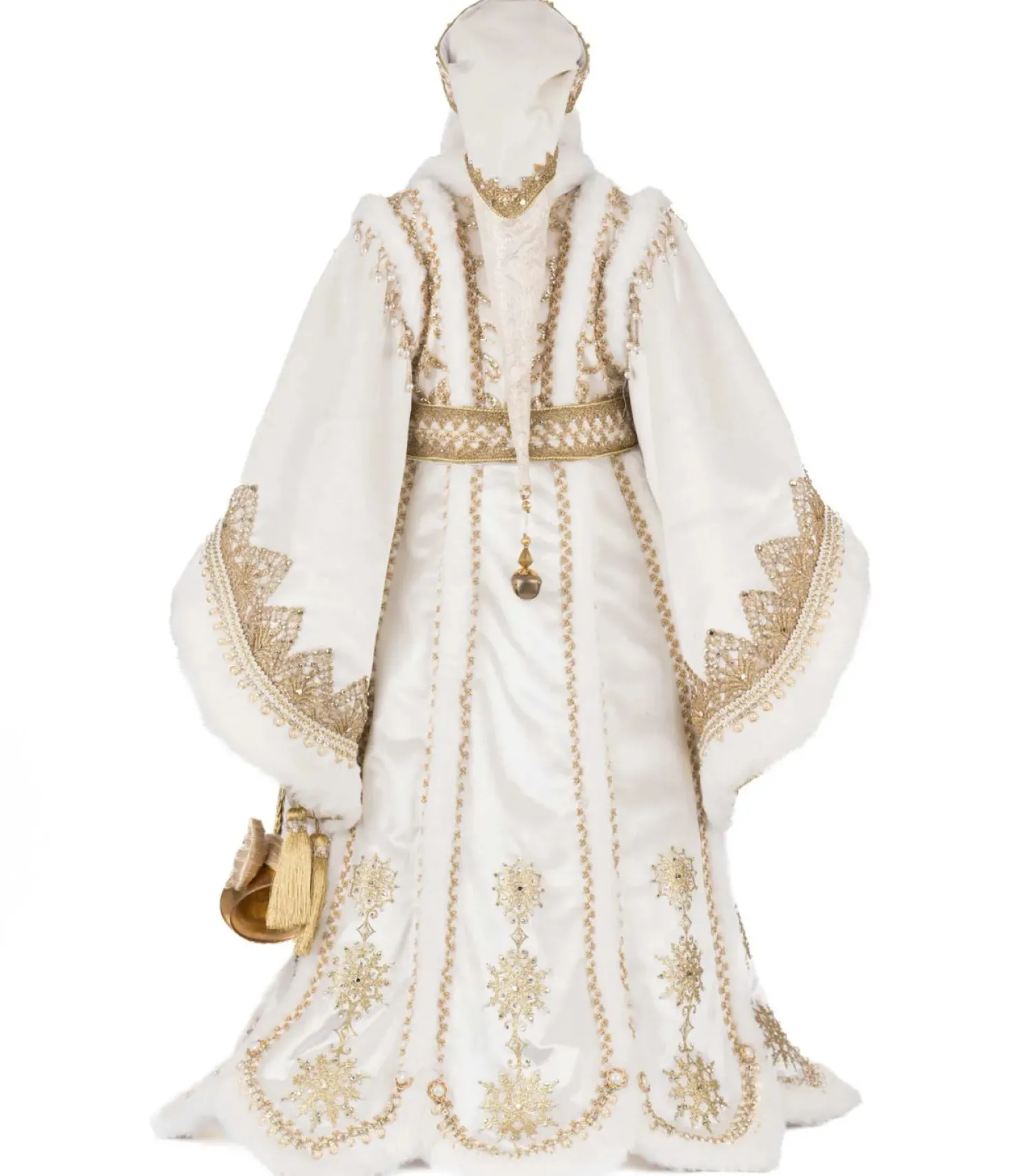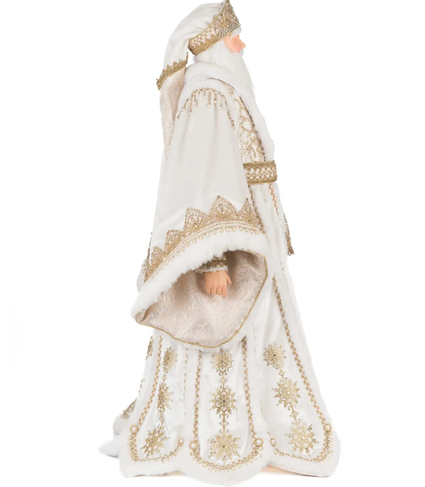 Dressed in regal splendor, the Katherine’s Collection 36″ Bells of Brilliance Golden Leaf Santa Doll brings opulence and holiday magic to your décor. Santa wears a majestic floor-length white and gold coat, richly embroidered with shimmering gold thread and adorned with sparkling jewels that echo the brilliance of his ornate golden crown. Beneath, his coordinating shirt and gold-striped trousers add layers of texture and elegance, while his plush white and gold fur-trimmed boots complete the ensemble. With a commanding presence and radiant style, this Santa is sure to be the centerpiece of your holiday celebration—turning heads and spreading joy wherever he stands.Made by Katherine’s Collection.Dimensions:20.5 × 20.5 × 36 in.
