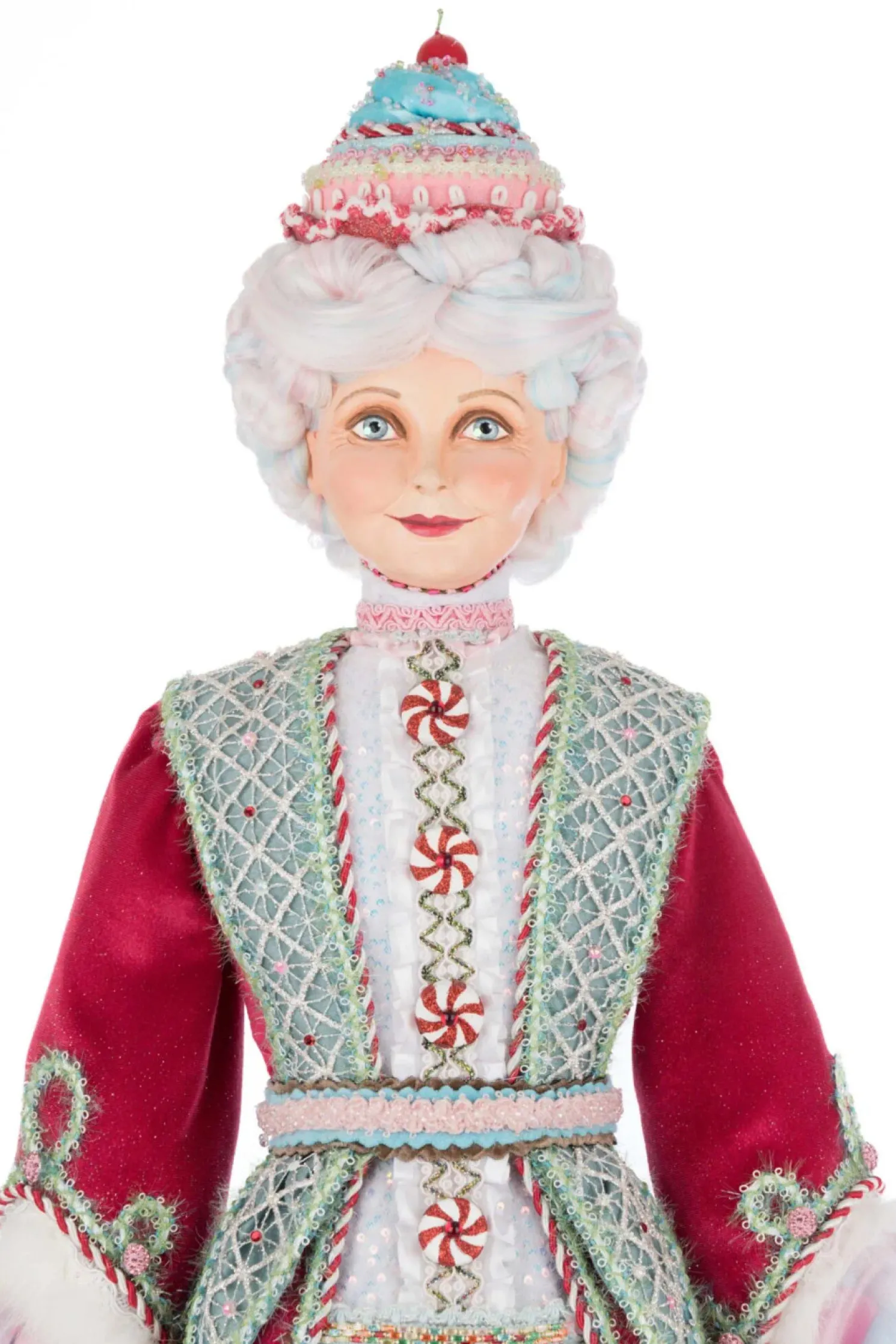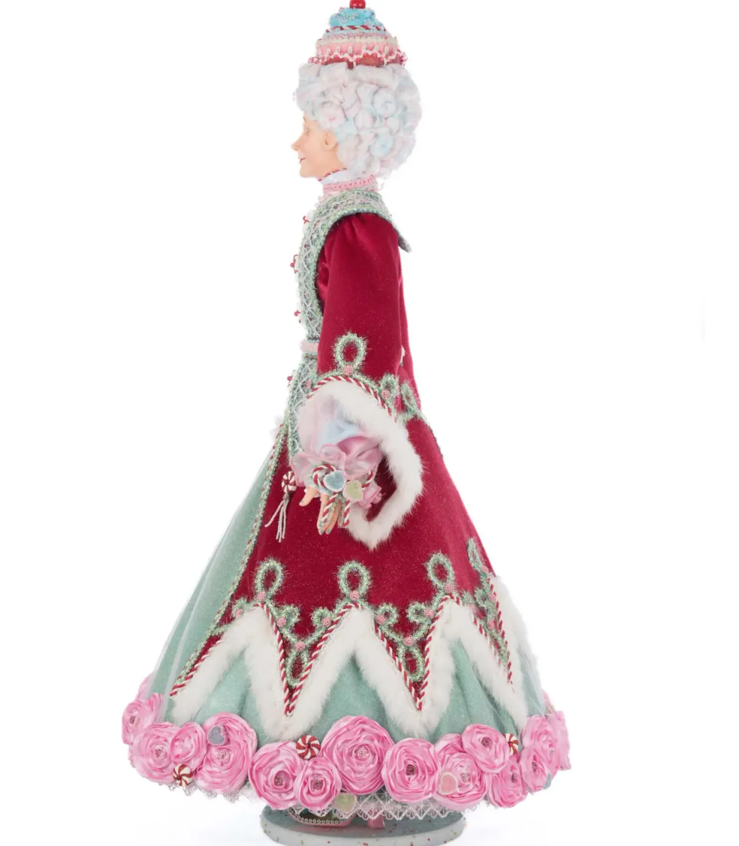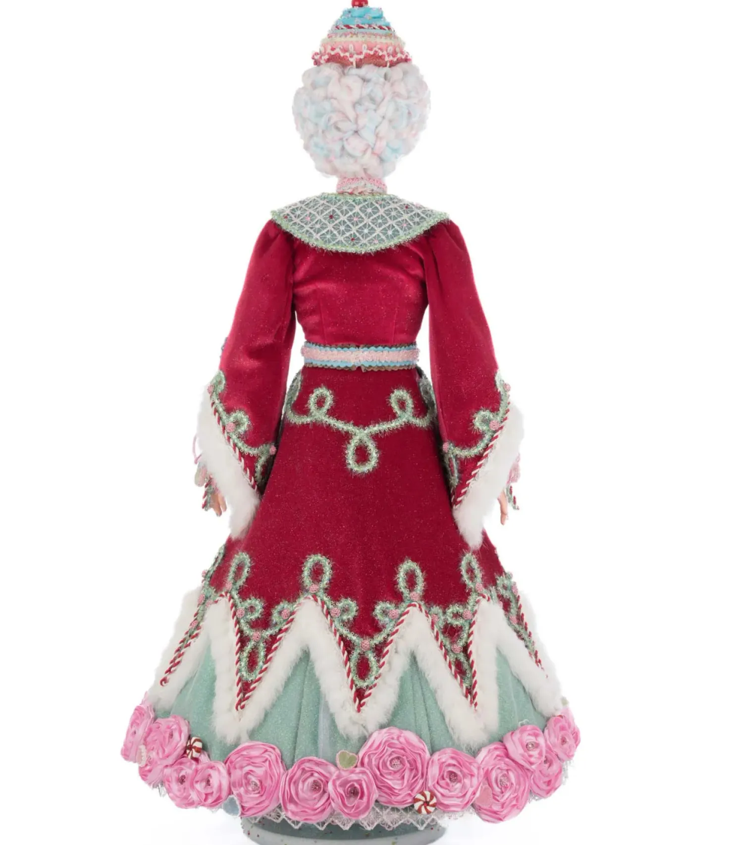 Get ready to celebrate with the Katherine’s Collection 36″ Sweet Delights Kandi Kringleberry Doll, your holiday party starter! Kandi shines in a vibrant red dress accented with teal blue and peppermint-striped trim, featuring adorable peppermint candy buttons down the front. Bright pink rosettes bloom along the hem, adding a playful pop of color. Her pastel pink and blue hair is styled into a charming bun, crowned with a whimsical tiered cake hat that completes her sweet and festive look. Kandi is sure to bring joy and sparkle to your Christmas décor this season!Made by Katherine’s Collection.Dimensions:20 × 20 × 36 in.Item #: 28-528719