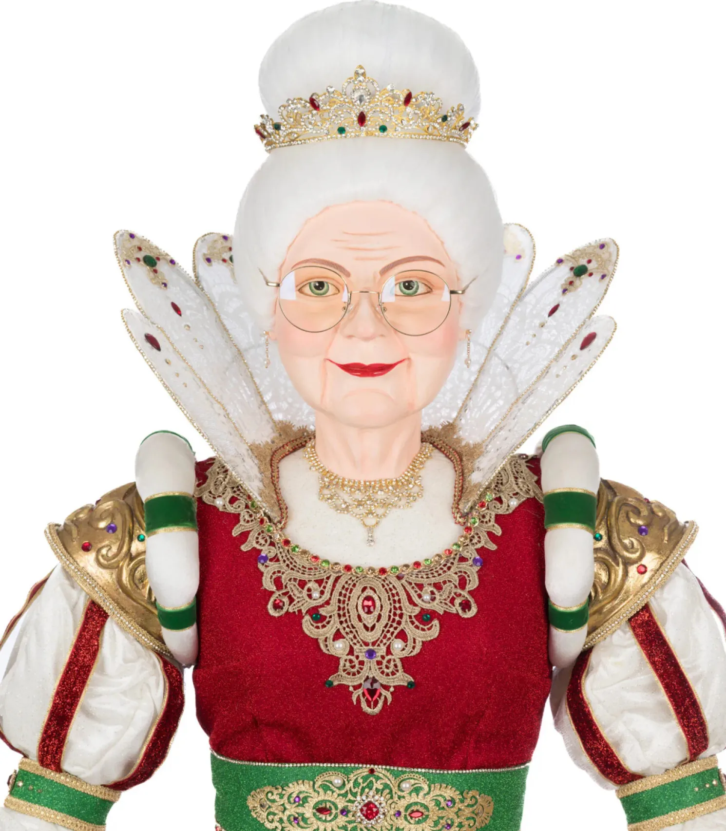 Christmas wouldn’t be complete without the elegant presence of Mrs. Claus! Queen Noelle Claus dazzles in a stunning red gown featuring a gold glitter ombré cascading from the white fur trim. Her striped puff sleeves are accented with regal gold armor-inspired details on the shoulders and wrists. A tall, dramatic collar frames her face, while intricate gold embroidery adorns her chest above a shimmering green waist belt. Her pristine snow-white hair is styled into a graceful bun, crowned with a glittering golden tiara. Perfectly paired with a life-size Santa, she brings royal holiday charm to your home this season!Made by Katherine’s Collection.Dimensions:38 × 32 × 64 in.Item #: 28-528810