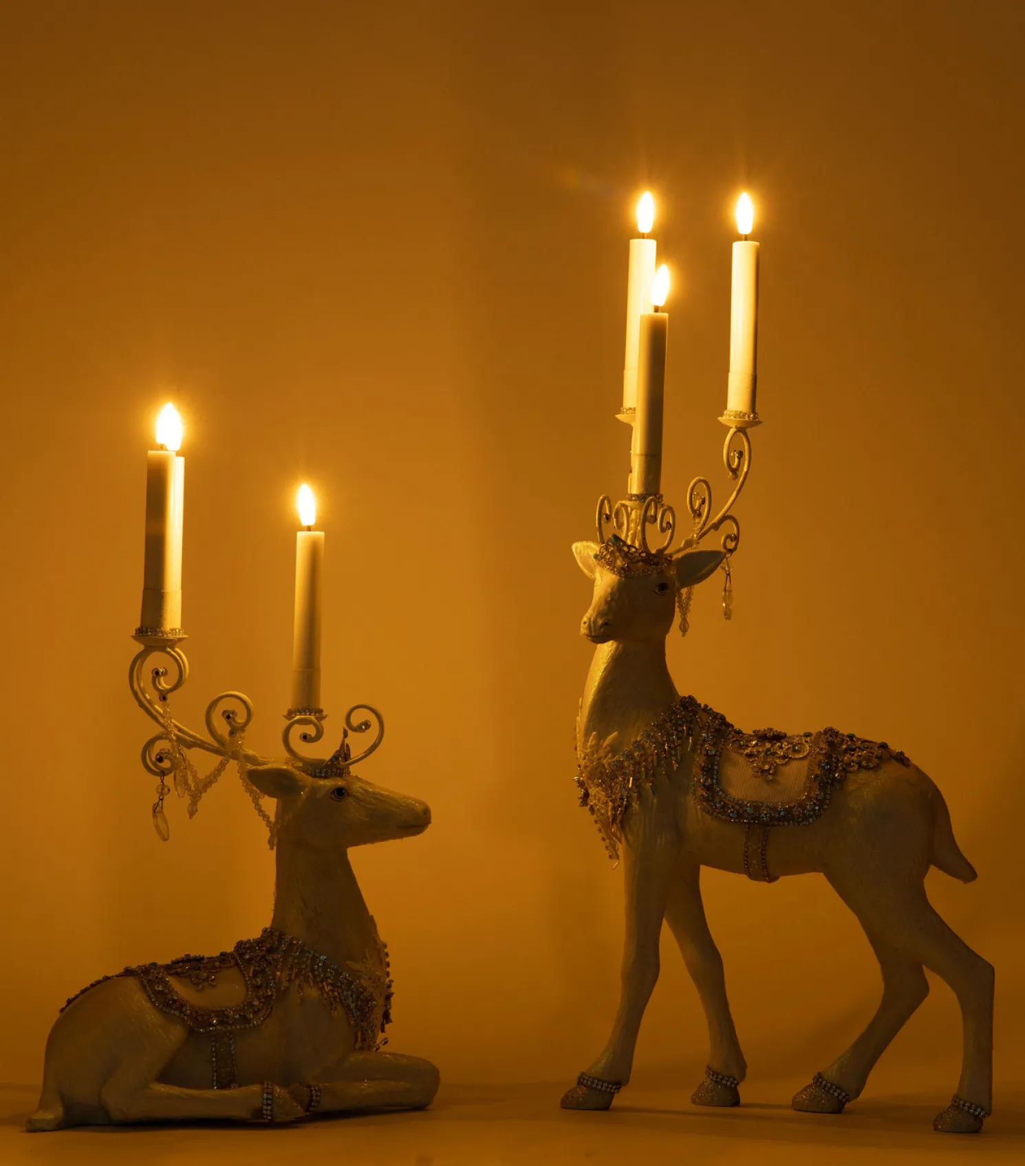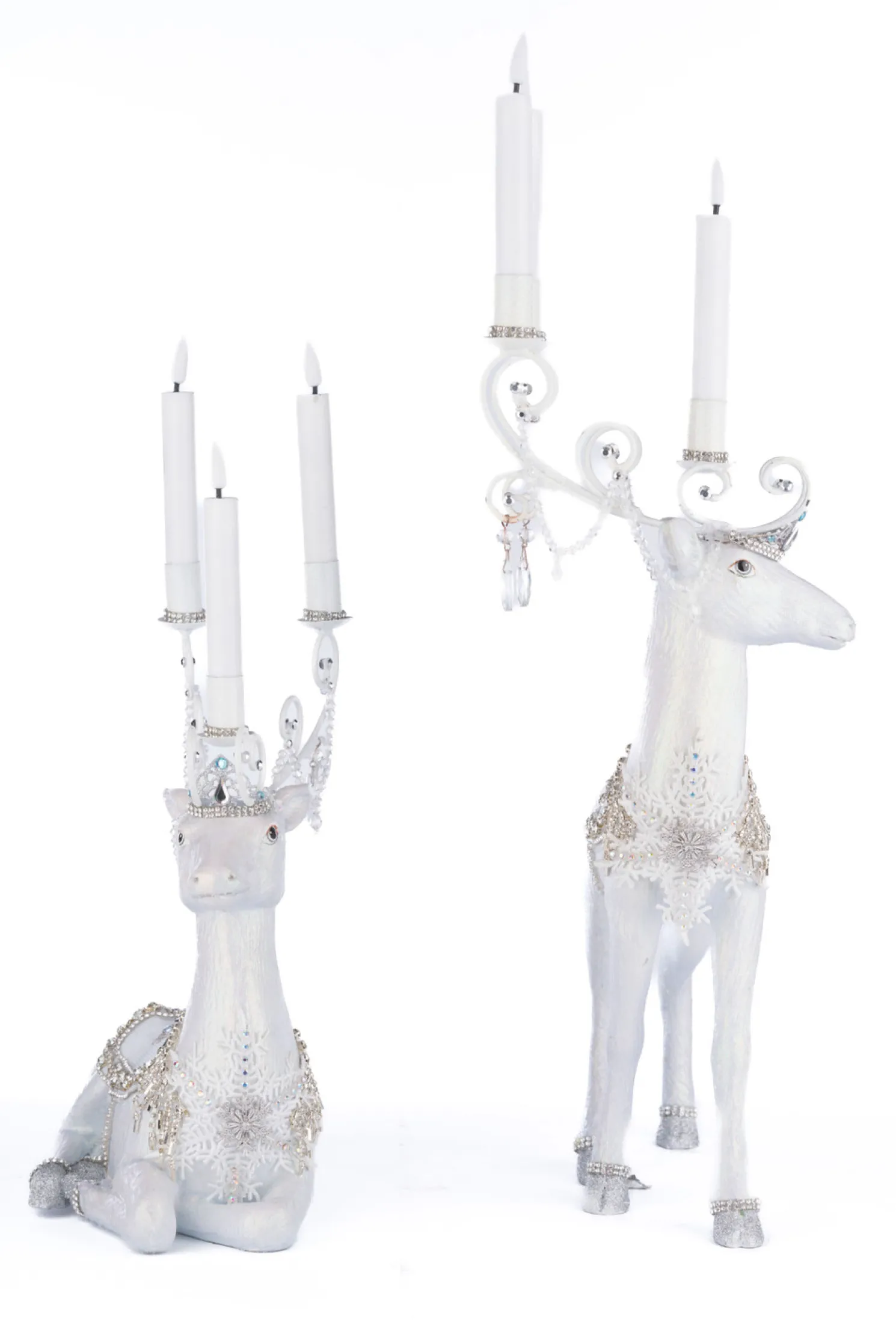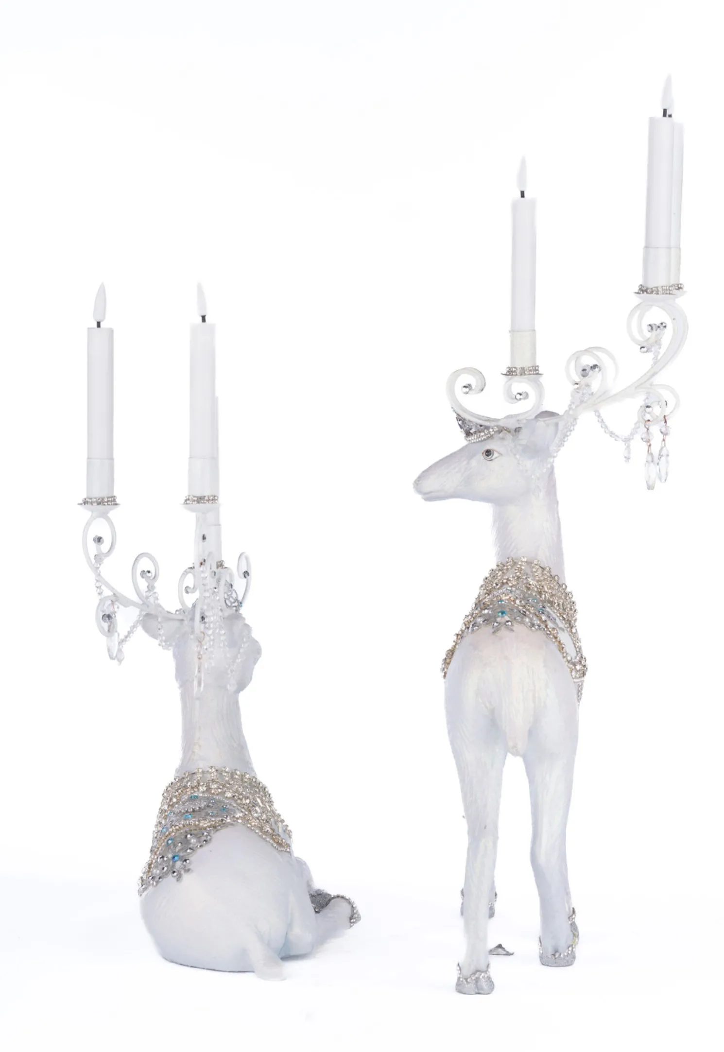 Stun your guests with these beautiful Christmas candle holders from Katherine’s Collection! Each deer is a brilliant white wearing saddles made of rhinestones and bright blue stones that match the crown on each of their heads! Their antlers are a glittering silver with swirl designs with a trio of cups to hold a standard sized taper candle!Includes battery operated candles.Made by Katherine’s Collection.Dimensions: 9.25 × 7.25 × 16.5 in or 9.25 × 5.75 × 11.5 in.