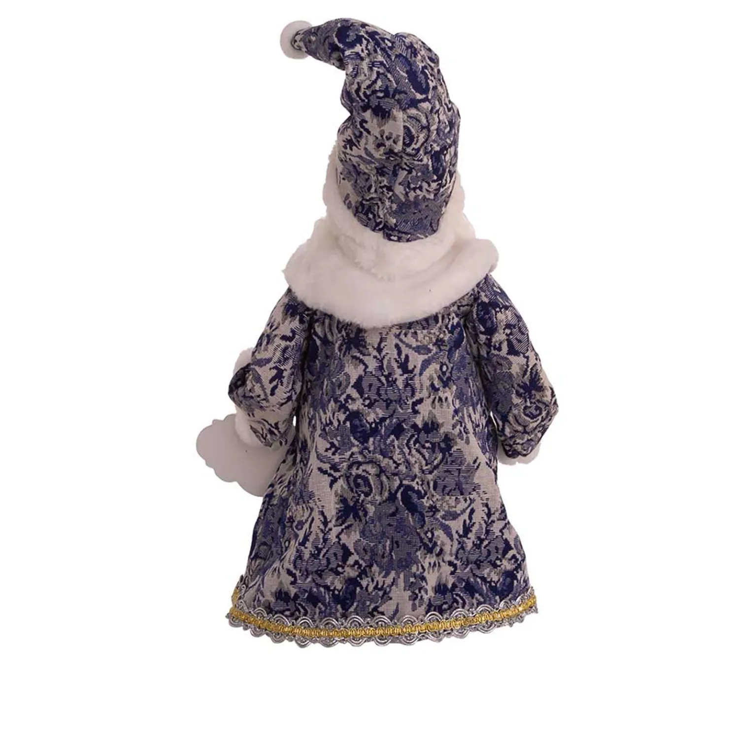 Santa is dressed in his most festive outfit made of bright blue pants, a speckled white and blue top with gold embroidery, silver boots, and a long blue and white delftpatterned floor length robe! His hat matches his robe, and in his blue gloved hands he holds a large sign reading “Merry Christmas”!Made by Kurt Adler.Made of polyester and resin.Dimensions: 18″ tall.