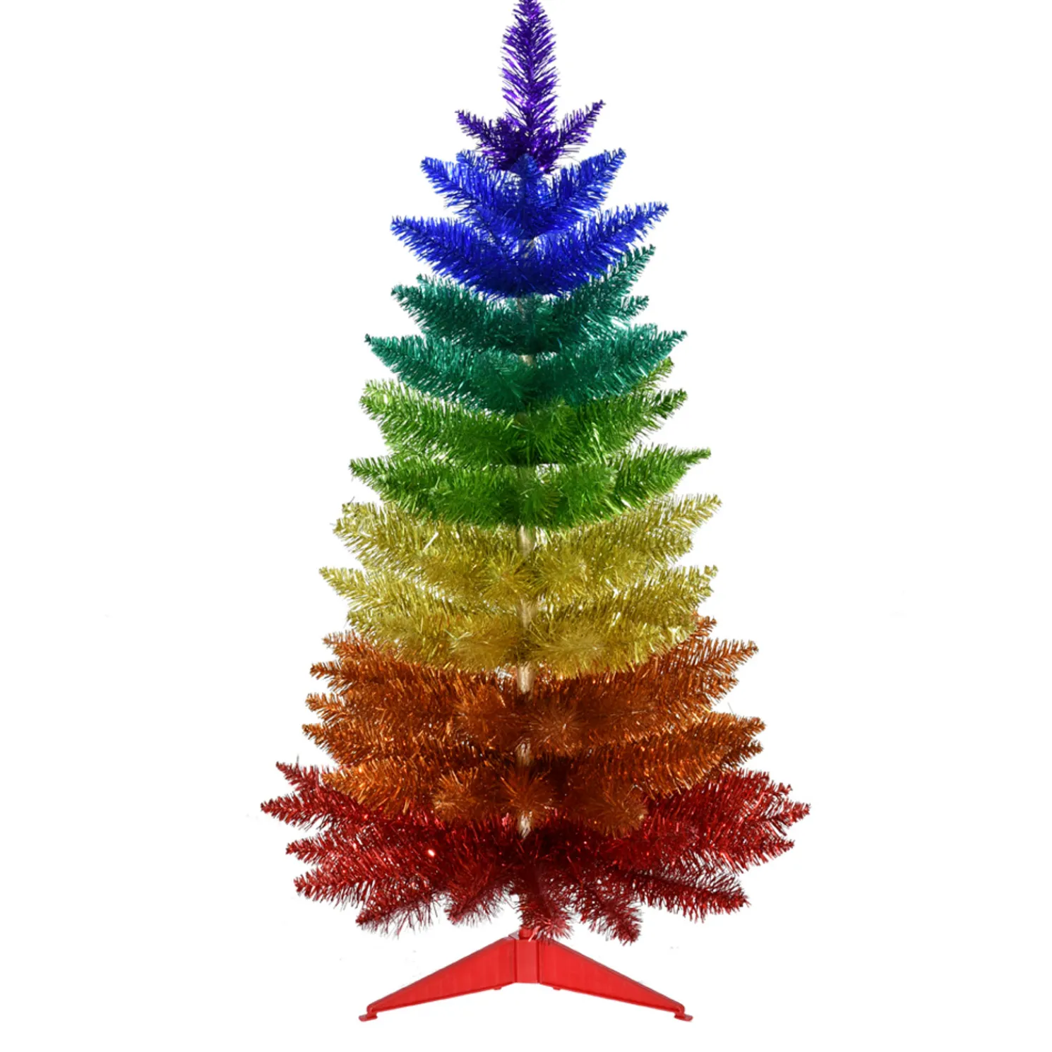 Add a bright pop of color to your home this holiday season with this tree! It features 7 different colors, red, orange, yellow, green, turquoise, blue, and purple wit a red base. Hang your favorite ornaments on this colorful tree for a superfun look! Sold individually. Made by Kurt Adler.Made of metal and PVC.Dimensions: 3′ or 4′.