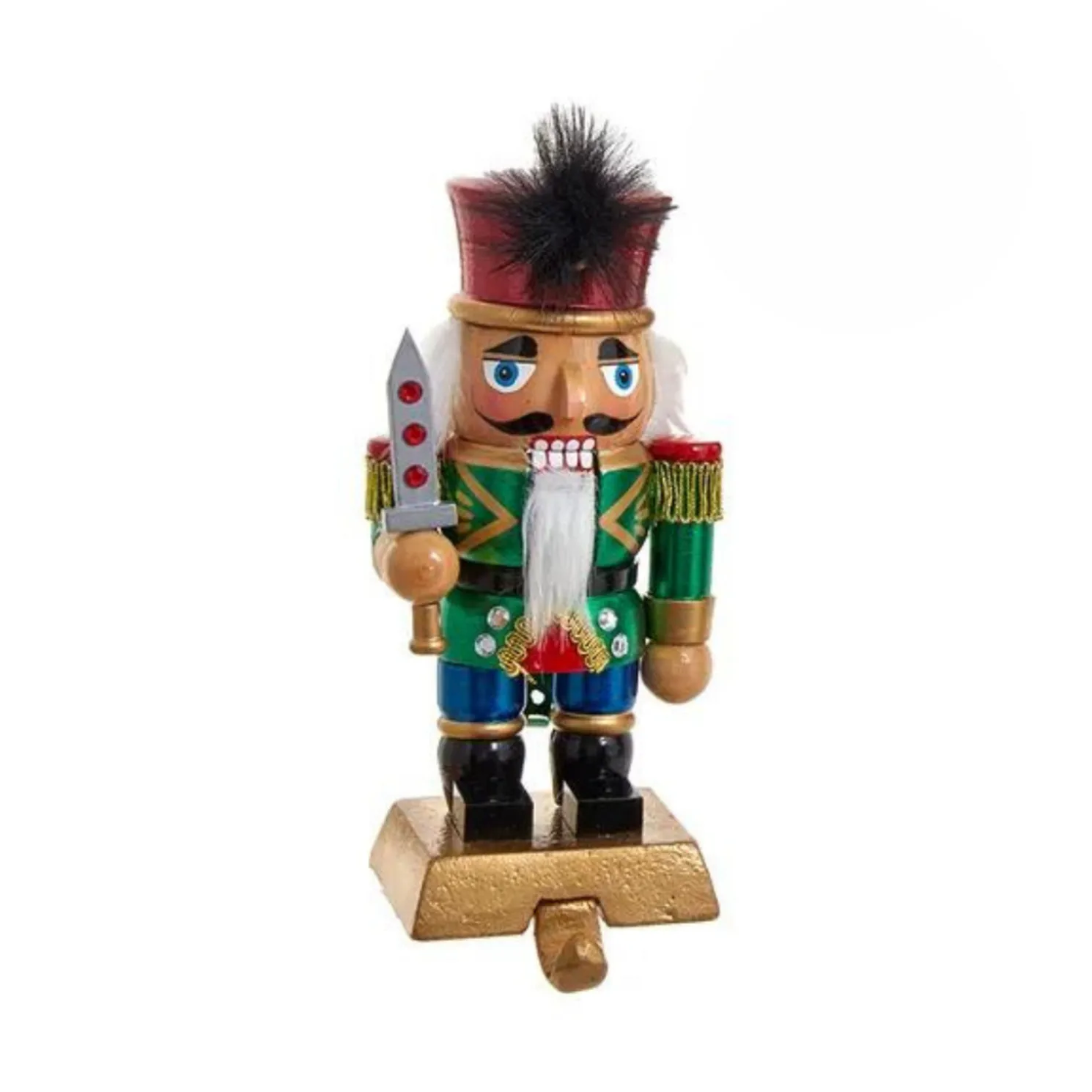 Hang your stockings with care and style this holiday season! Each nutcracker stocking hanger features a small nutcracker with white hair, gold embroidery trimmed jackets, black boots, and rhinestone accents! Choose which one fits your vibe or snag yourself all three to line along your mantle! Each sold individually.Made by Kurt Adler.Made of wood and iron.Dimensions: 7.5″ tall.Item #: C5969