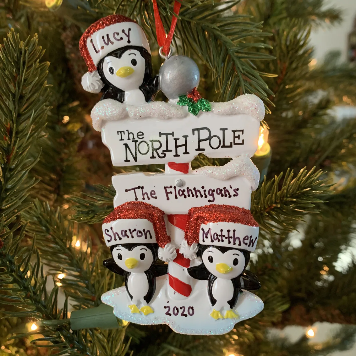 Celebrate your family of 3 with this adorable ornament! It features three penguins with matching Santa hats huddled in front of the North Pole sign! Get each family members nameon the hats, your last name on the sign, and the year on the snow below!Made of resin.Dimensions: 2.5″ x 4.5″.Item #: OR1739-3