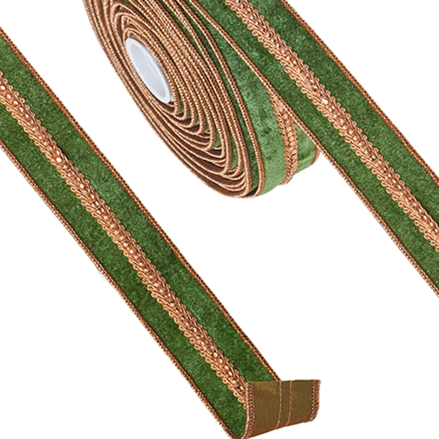 This stunning ribbon features a green velvet trimmed with gold embroidery and lined with gold embroidery and tiny jewels down the center!Made by Raz Imports.Made of polyester.Dimensions: 1.5″ x 10 yards.