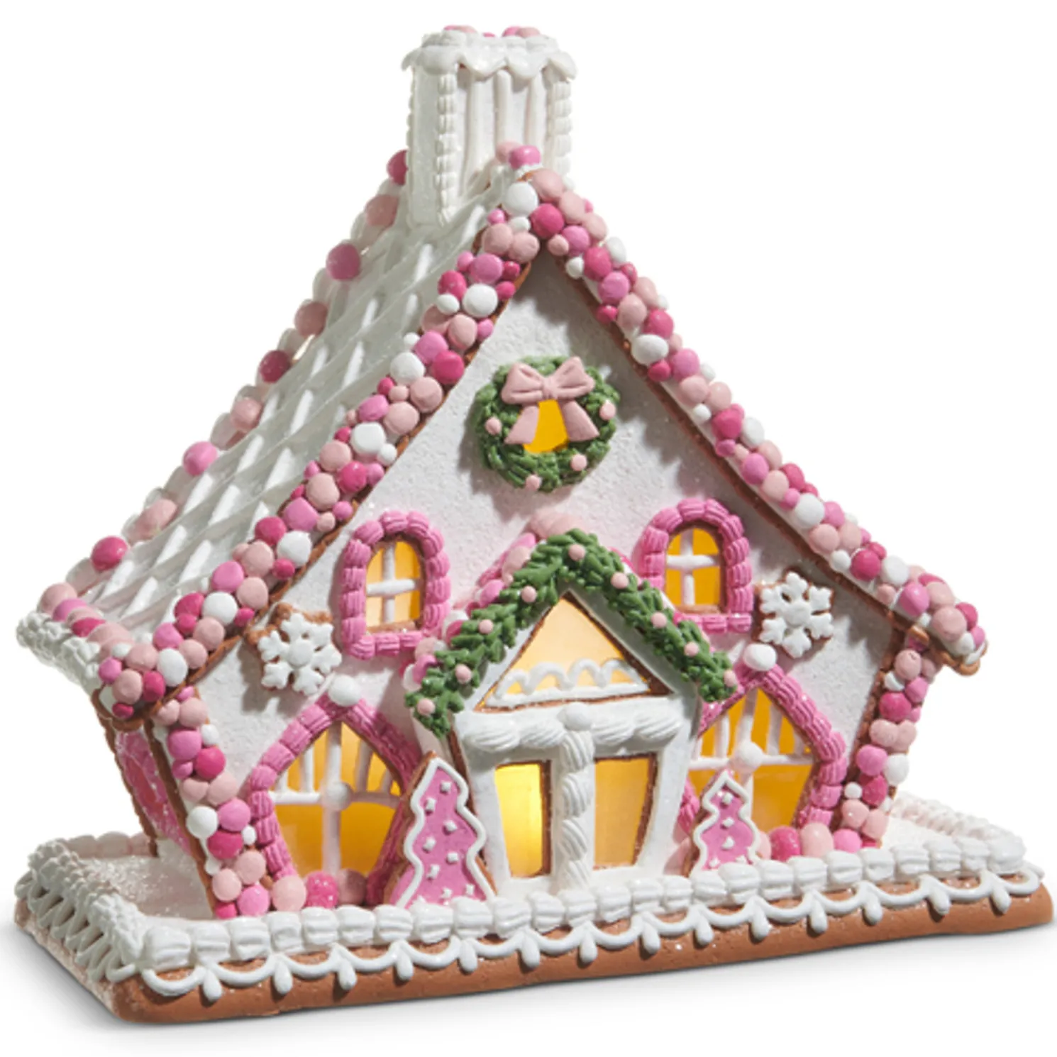 Sweeten your holiday village with these charming pink gingerbread houses! Each house features white icing-covered walls, delicate pink piping, and candy accents from top to bottom. Choose between a tall, slender townhouse or a short, wide cottage—both are adorned with bold pink cookie trees flanking the front door for a whimsical touch. Perfect for adding a pop of pastel to your Christmas décor!Each sold individually.Requires 3 AA Batteries, not included.6 Hour Timer Repeats Every 18 Hours.Made by Raz Imports.Made of clay dough.Dimensions:11.5″ L X 6.58″ W X 10.75″ H or6.5″ L X 6.25″ W X 12″ H. Item #: 4516662 or 4516663