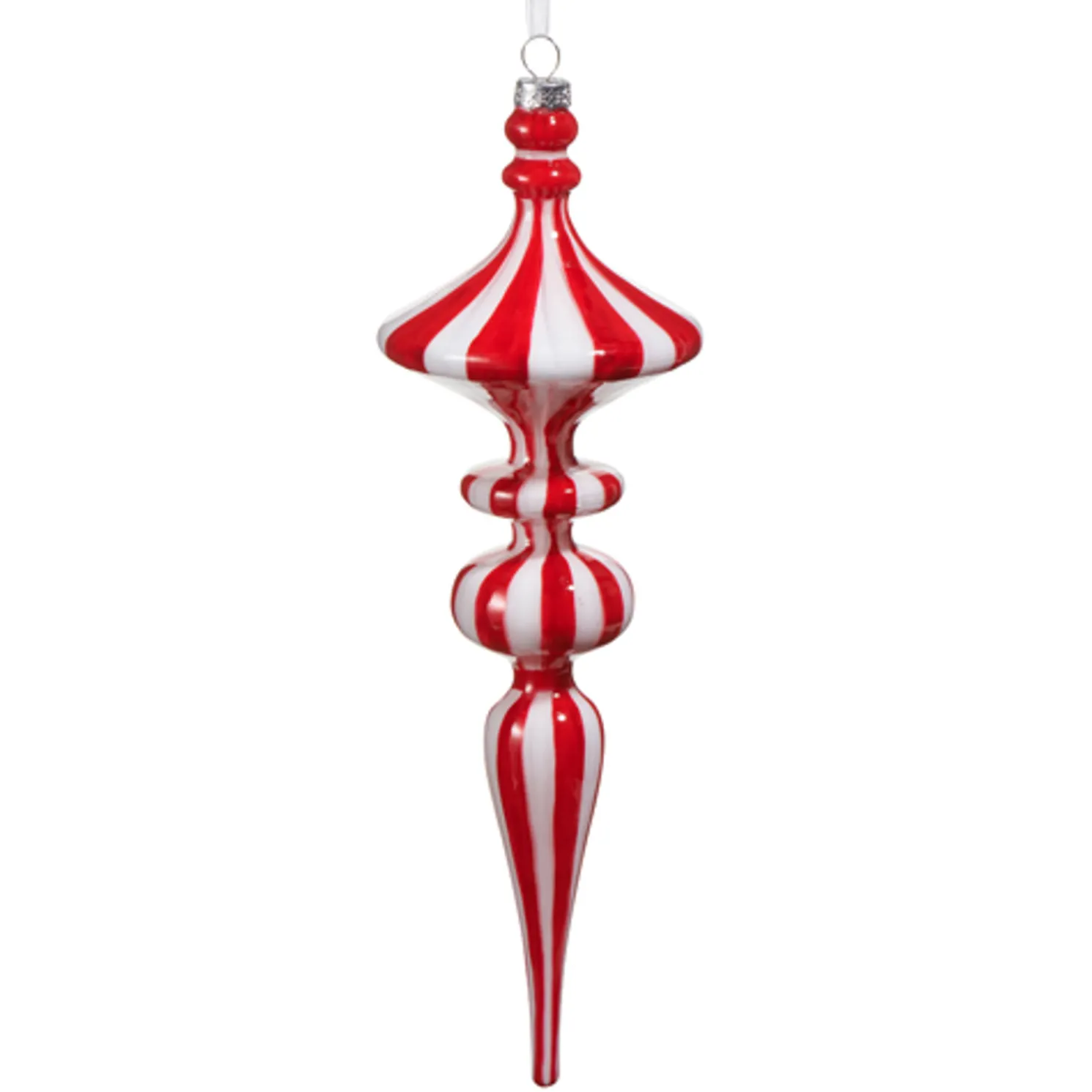 The red vertical stripes that decorate the length of this white ornament make it the perfect peppermint finial!Made by Raz Imports.Made of glass.Dimensions:3.5″ D X 11.5″ H.