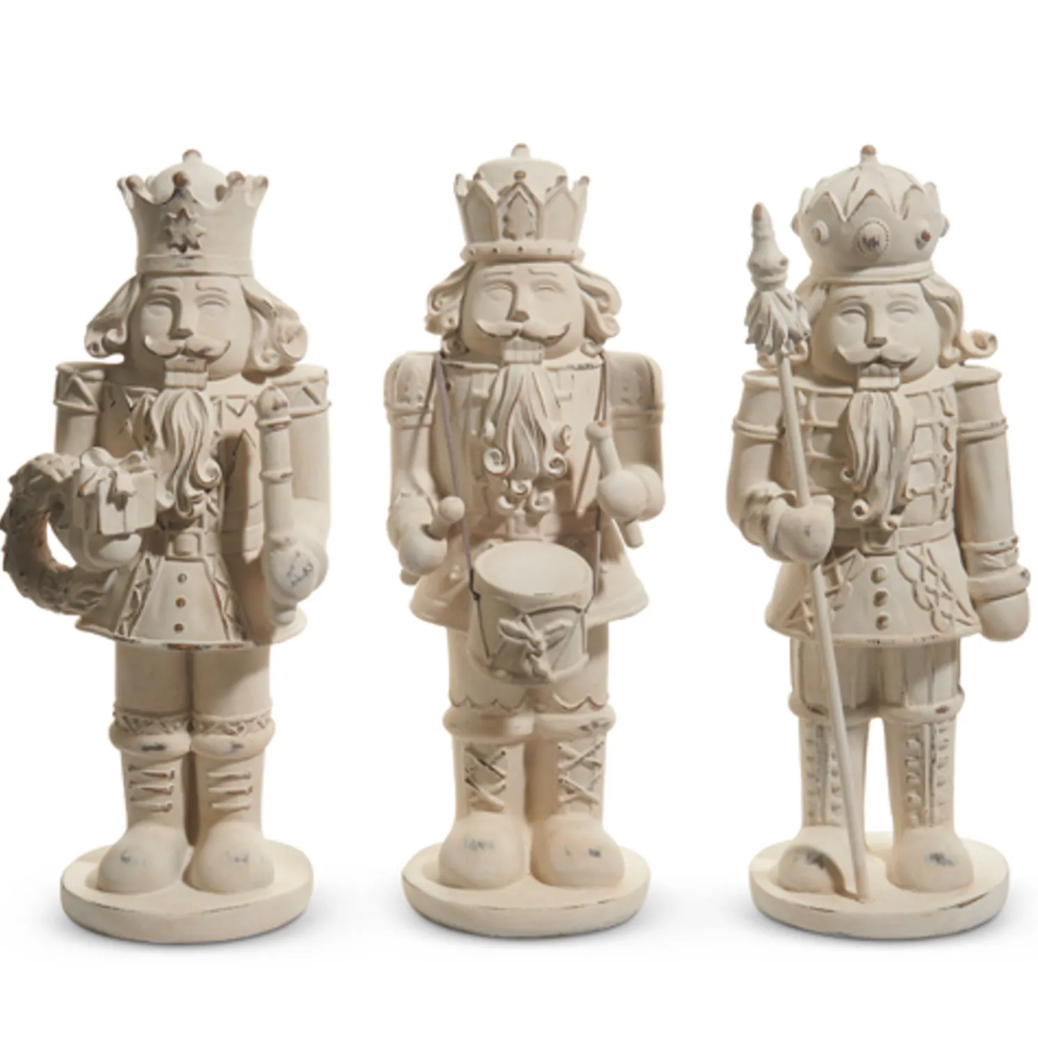 These nutcrackers feature a soft ivory finish with a distressed whitewashed look that gives them timeless charm. Each is topped with a regal crown and carries a festive item—a drum, a wreath, or a staff. Perfect for displaying on your mantle, entryway table, or bookshelf, they bring a touch of rustic elegance to your Christmas décor.Sold as a set of 3.Made by Raz Imports.Made of resin.Dimensions:4.5″L X 4″W X 11.75″H; 5.25″L X 4.5″W X 11.75″H; 4″L X 4.75″W X 11.75″H.