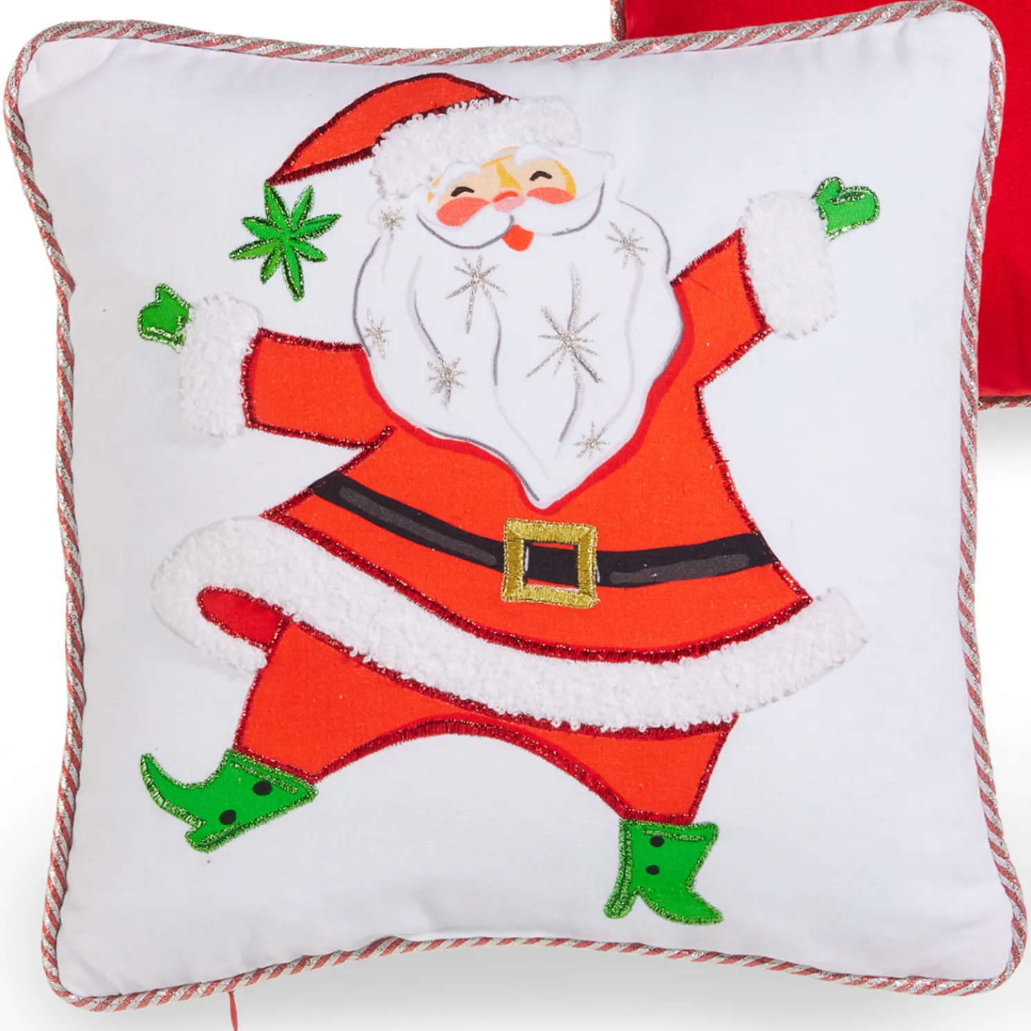 Get up and get movin’ with this joyful Dancing Santa pillow! Santa is all smiles with open arms, green mittens, and matching green shoes, ready to spread holiday cheer. His fluffy white beard is accented with silver star shapes, and a playful green star dangles from the tip of his hat. Choose between Santa in a classic solid red suit or a fun red and white striped outfit—either option adds a festive, whimsical touch to your holiday seating or bedding! Each sold individually.Made by Raz Imports.Made of cotton and polyester.Dimensions:12″L X 12″H.