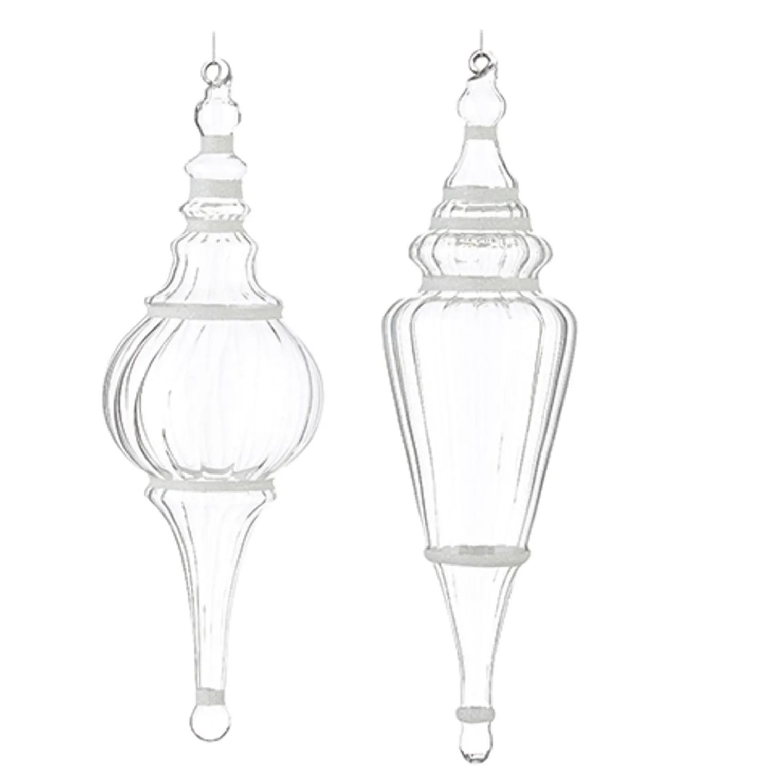 These stunning finials feature clear glass with white glitter stripes! They are sure to sparkle on your tree this holiday season!Each sold individually.Made by Raz Imports.Made of glass.Dimensions: 15.5″ tall.Item #: 4224530