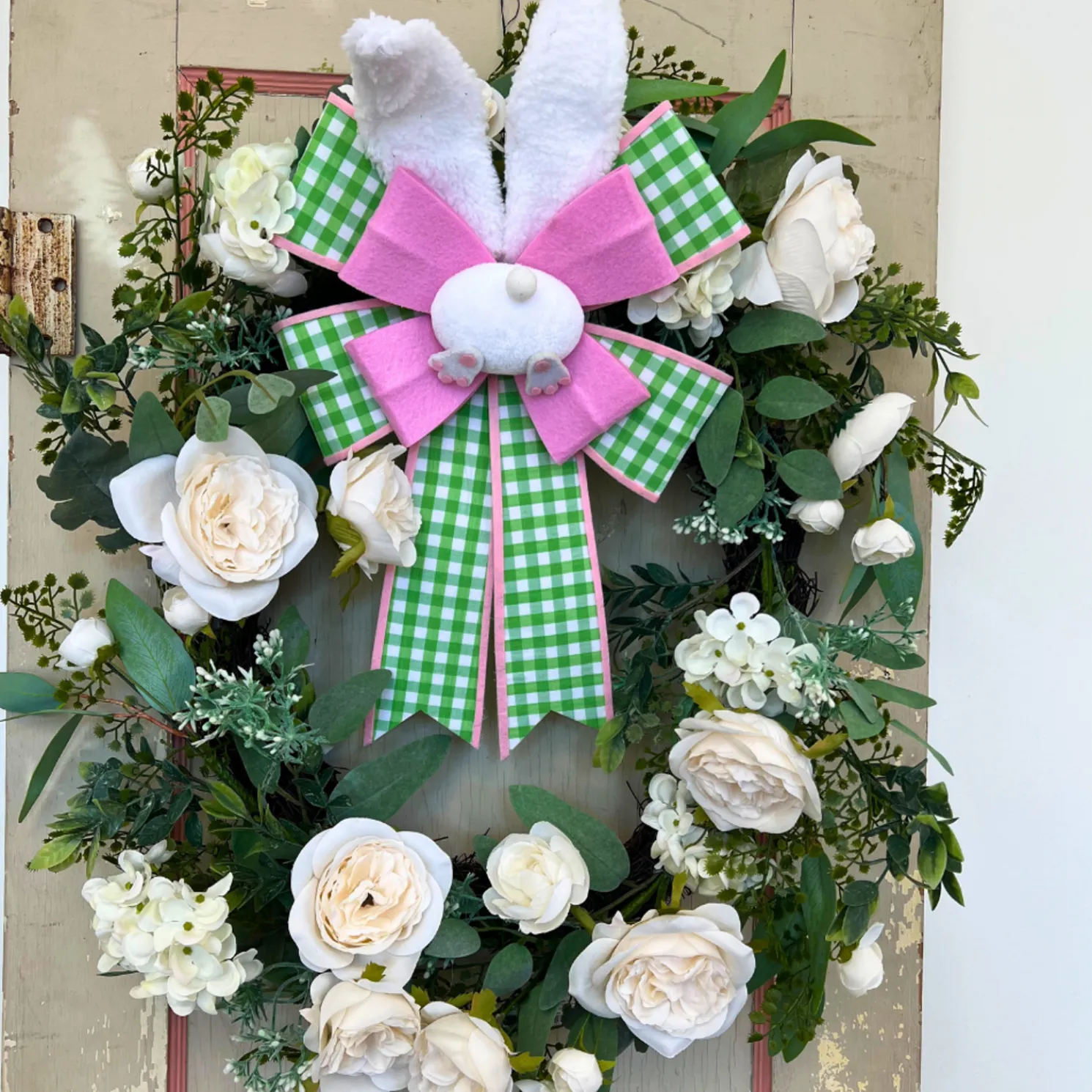 Decorate the center of your favorite wreath or add to these adorable bow to your door this Easter! Each one is a fun colorful check with tall bunny ears and a cut as can be bunny booty in the center!Sold individually.Made by Raz Imports.Made of Polyester, Foam, Metal and Paper.Dimensions:10.5″L X 3″W X 19″H.