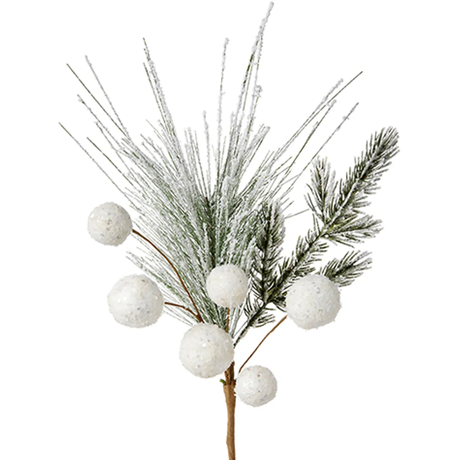 Bring the outside IN with this beautiful pick! It features snow dusted branches with lush white snowballs!Made by Raz Imports.Made of polyester and plastic.Dimensions: 20″.Item #: F4206702