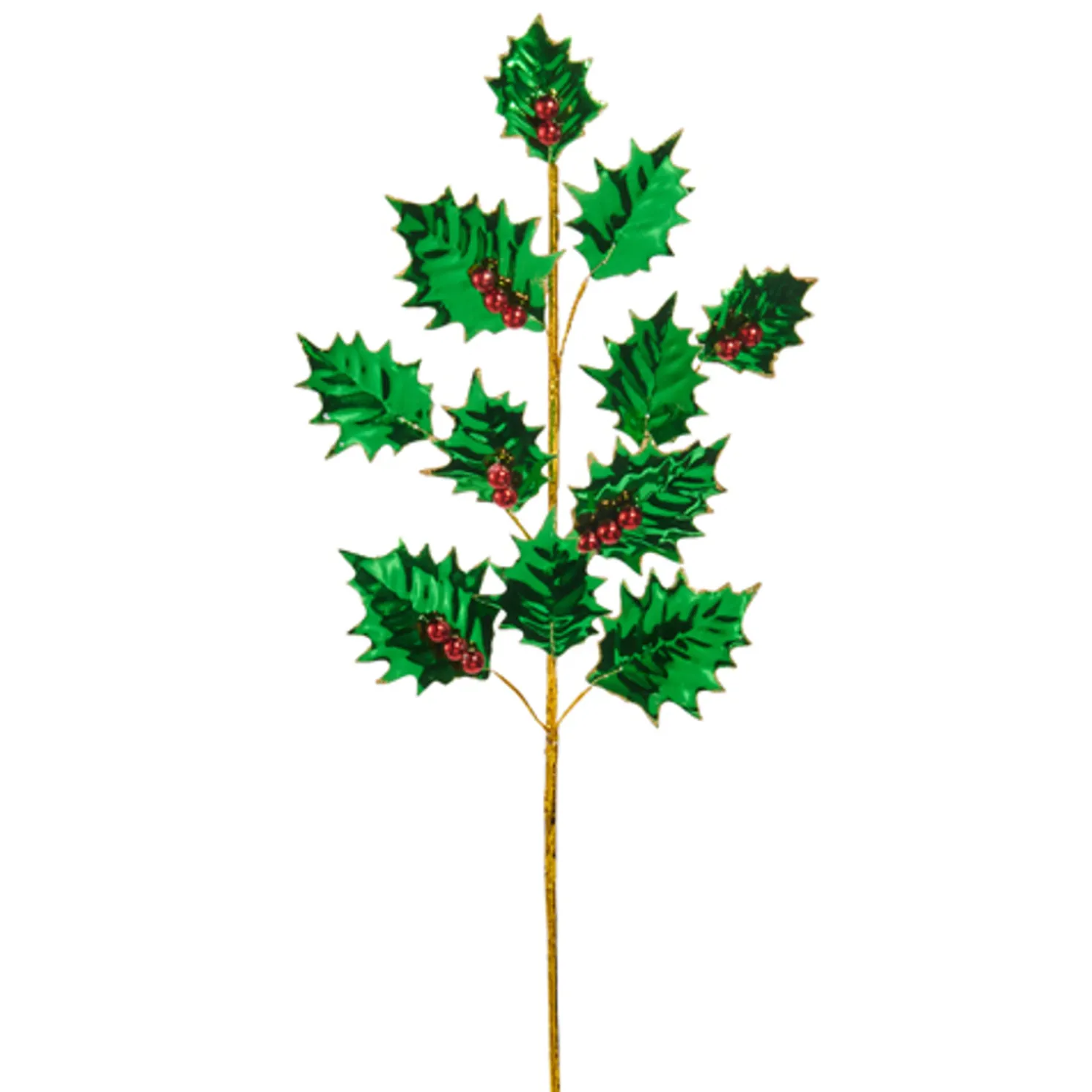 Shiny metallic green leaves and tiny shiny red berries make this a unique and fun Christmas tree spray that is sure to look fabulous on your tree this holiday!Made by Raz Imports.Made of plastic.Dimensions: 24.5″.