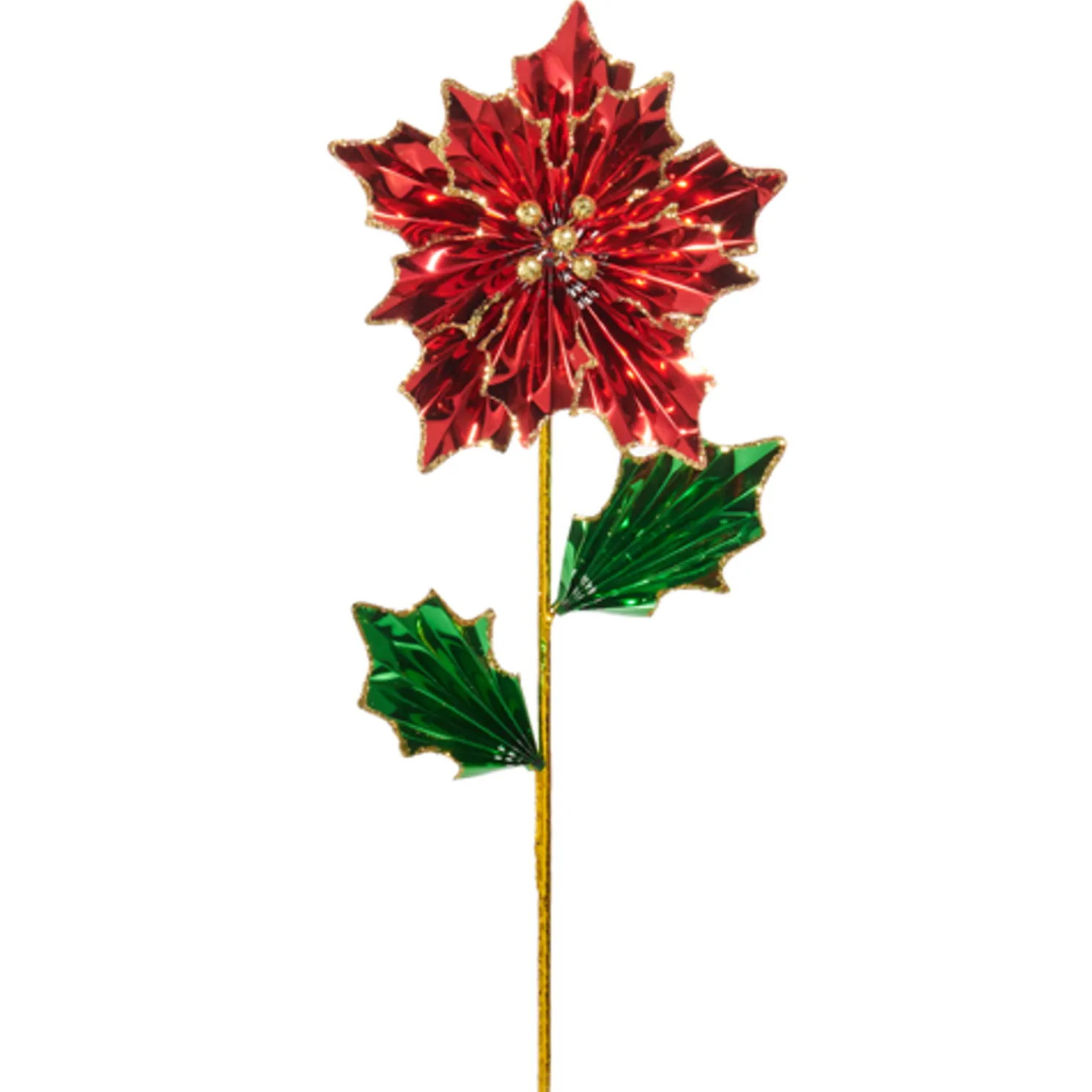 Shimmering like a jewel, this poinsettia spray features a metallic red bloom and metallic green leaves traced in sparkling gold glitter!Made by Raz Imports.Made of plastic.Dimensions: 24″ with 8″ bloom.