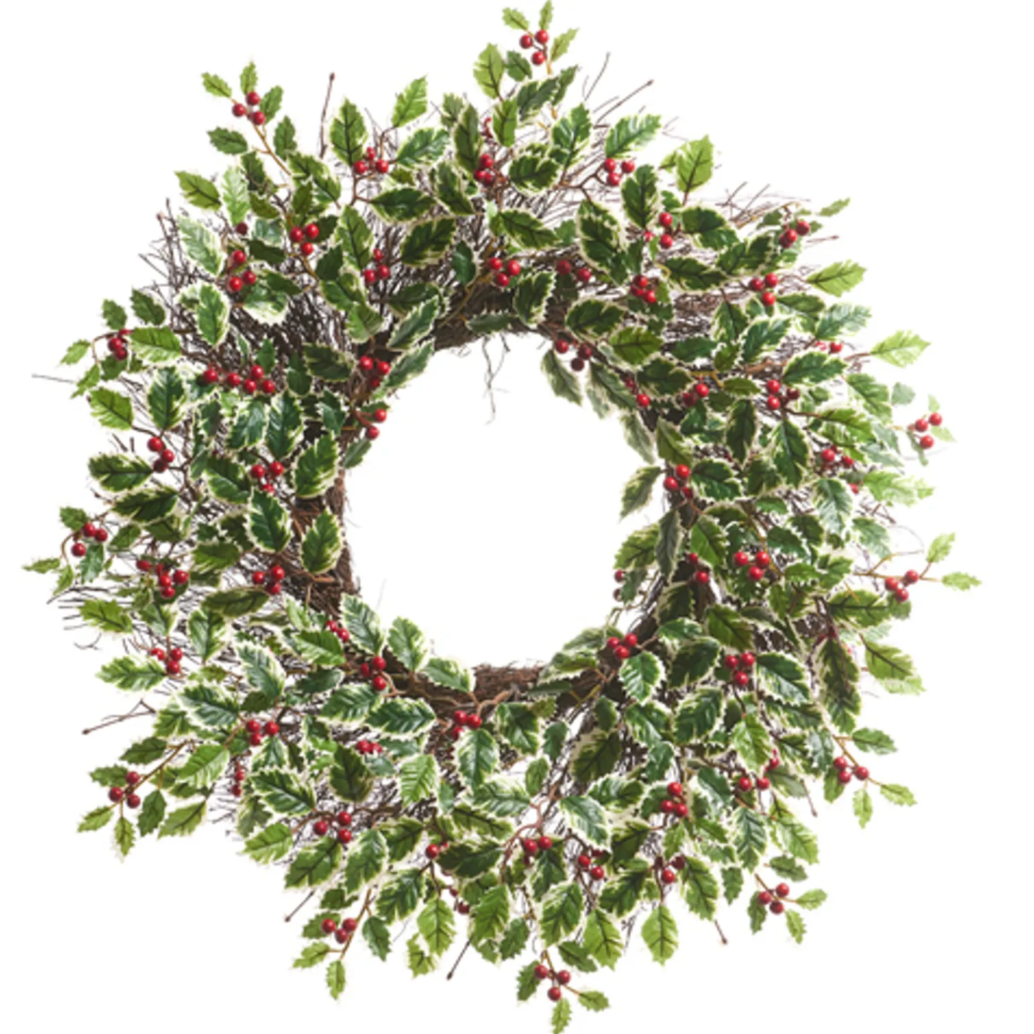 This beautiful Christmas wreath features green and white variegated holly leaves and bright red berries on a twiggy brown wreath base! Perfect to place on your front door to welcome all guests this holiday season!Made by Raz Imports.Made ofPolyester, Foam, Twig and Plastic.Dimensions: 26″.Item #: W4402461