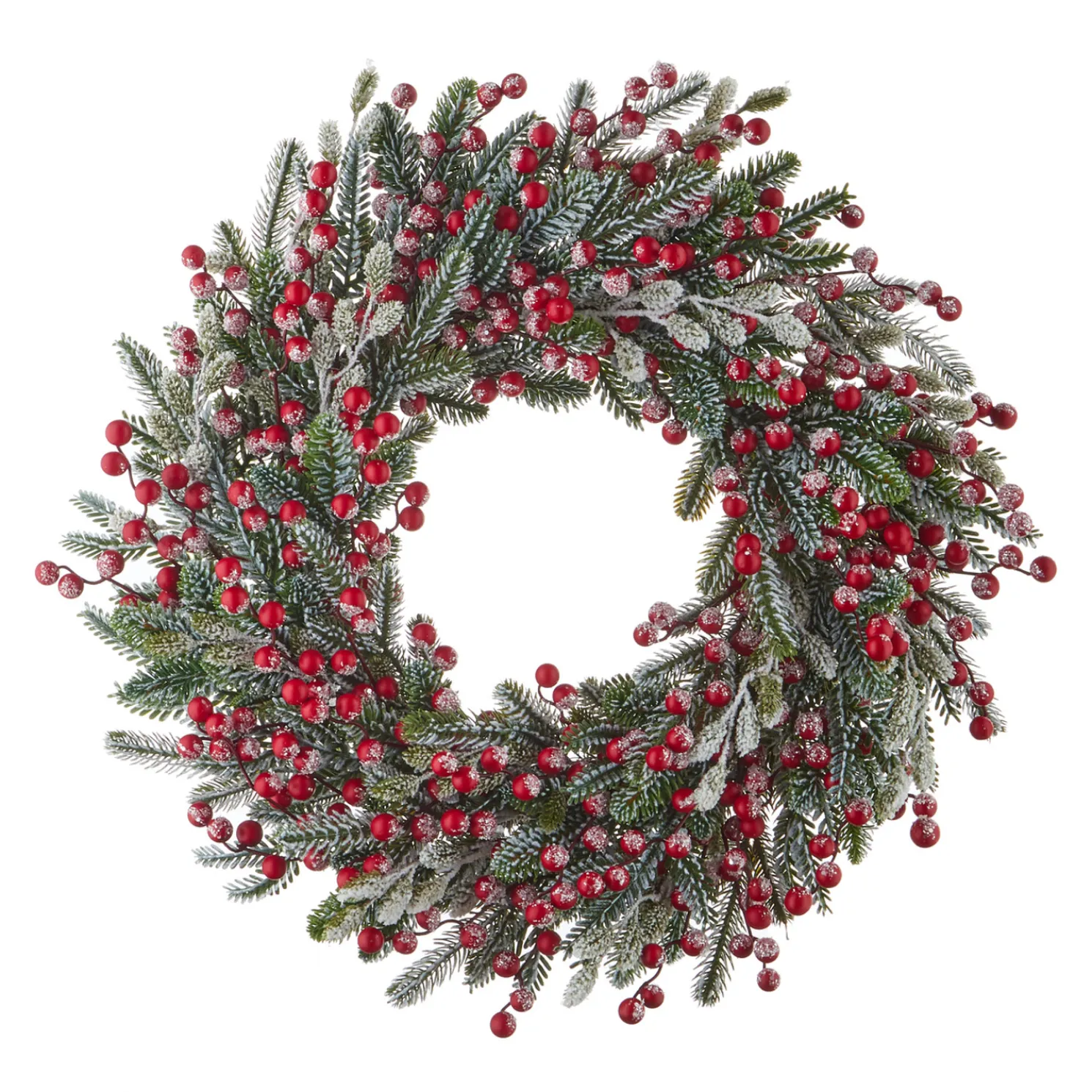 This stunning wreath features lush fir branches and bright red berries dusted with snowy ice! Perfect to hang on your front door or above your mantle!Made by Raz Imports.Made of plastic.Dimensions: 28″.Item #: W4126005