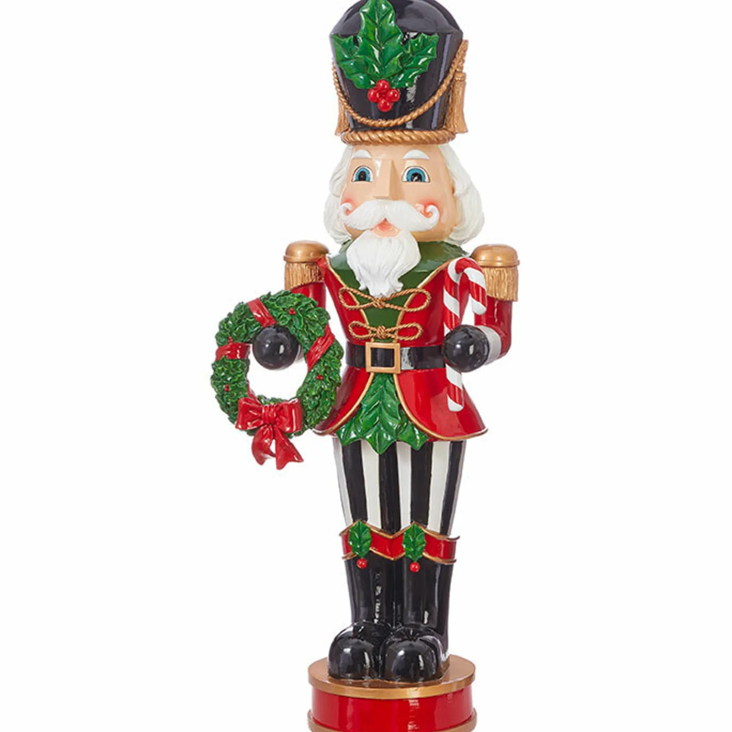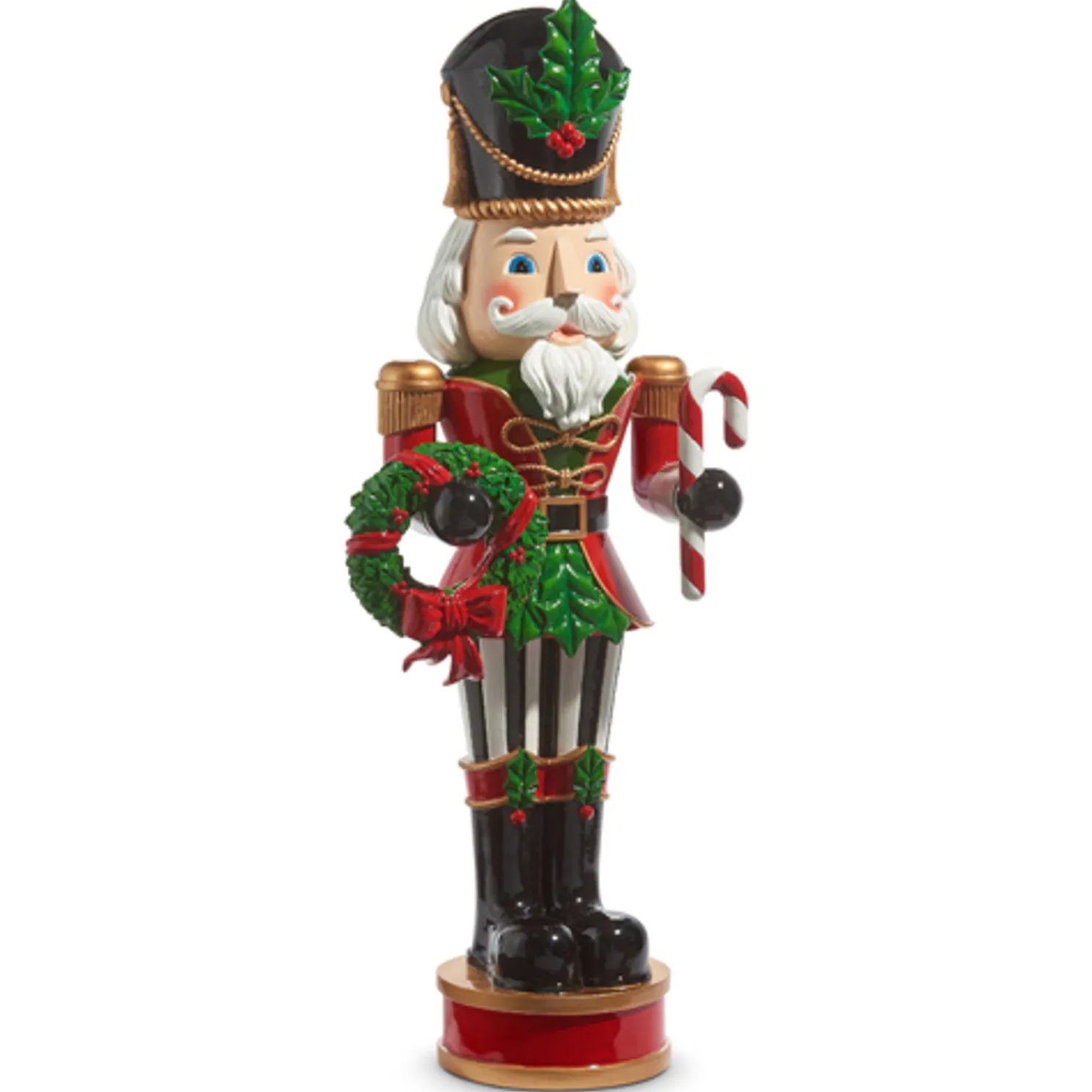 Make a statement with these bright colored large nutcracker figures! These nutcrackers stand on a red and gold base holding a wreath in one hand and a candy cane in the other, dressed to impress! With stunning striped pants, and holly leaf accents, he would look great standing next to your doorway or your mantle this Christmas season! Choose between the 32″ or 43.5″ nutcracker figures. Sold individually, Made by Raz Imports.Made of stone powder.Dimensions:18″L x 11.5″W x 43.5″H. and 12″ L X 8.5″ W X 32″ HItem #: 3901681 and4401600