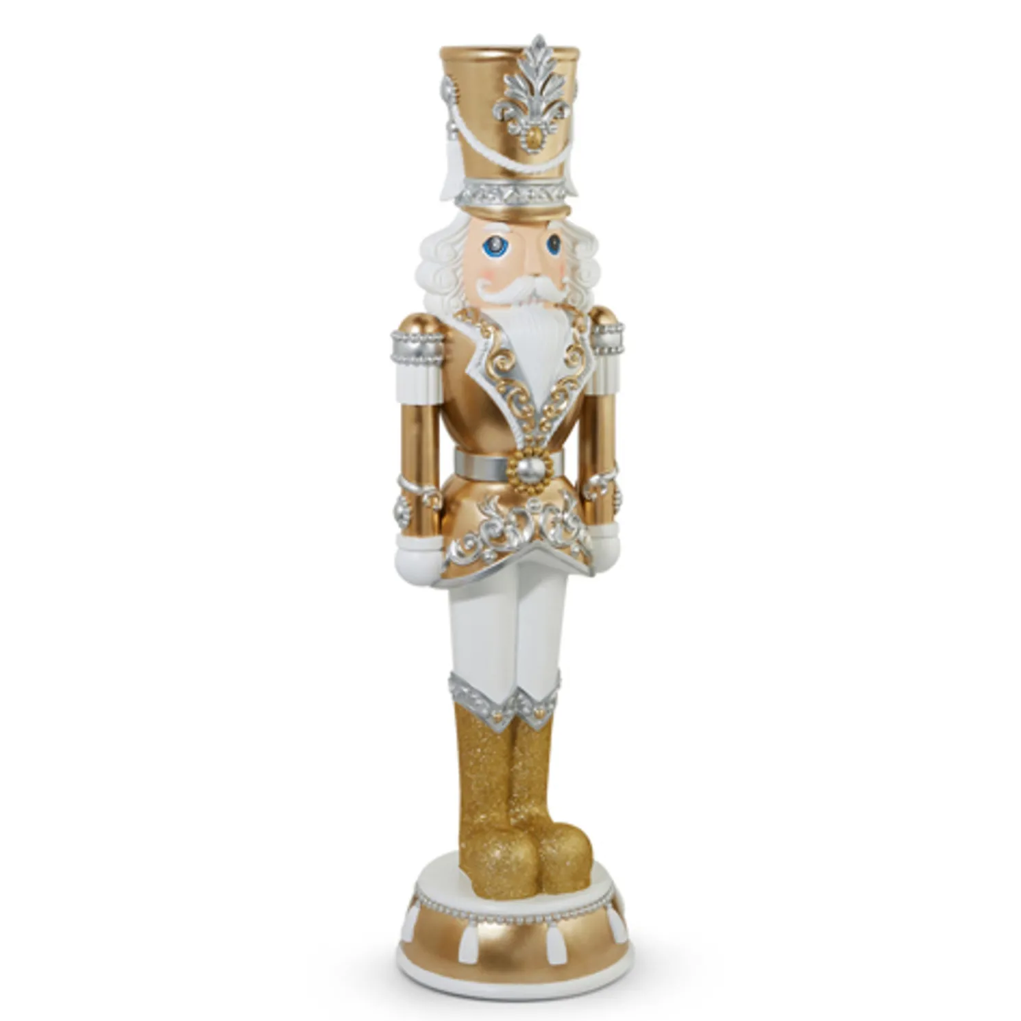 Make a grand statement this holiday season with this stunning nutcracker! Featuring snow-white hair and bright blue eyes, he’s dressed in a shimmering metallic gold jacket accented with intricate silver and gold detailing on the lapels and hem. Crisp white trousers tuck neatly into sparkling gold glitter boots, and he stands proudly atop a small pedestal—perfect for adding a touch of regal charm to your entryway, hearth, or Christmas display.Choose 36″ or 48″!Each sold individually.Made by Raz Imports.Made of resin.Dimensions:10″ L X 9.75″ W X 36″ H or13″ L X 12.75″ W X 48″ H.