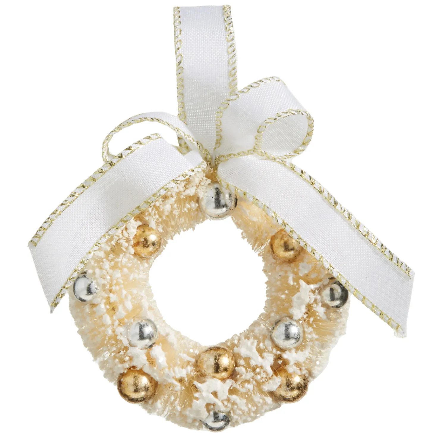 This creamy white sisal wreath has dollops of white snow among gold and silver metallic ball ornaments and a small white ribbon tied at the top! This ornament will make the perfect addition for your white and gold Christmas tree.Made by Raz Imports.Made of plastic, polyester, and sisal.Dimensions:5.5″ L X 1.75″ W X 4.5″ H.